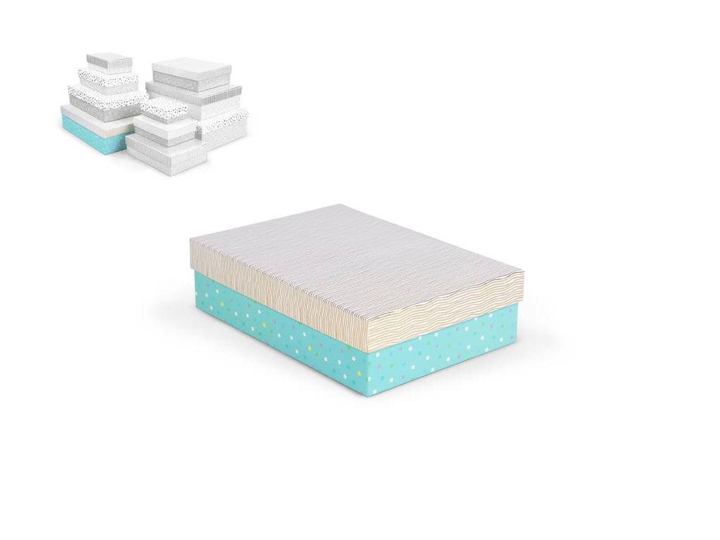 Darčeková krabička v kombinácii pastelových farieb s rôznymi vzormi, ako sú bodky, prúžky alebo štruktúrovaný povrch. Vzory a farby sú zladené tak, aby vytvárali harmonický a elegantný vzhľad. Vhodná na slávnostné príležitosti, dekoratívne účely, balenie osobných darčekov alebo na uloženie rôznych drobností. Po pridaní jednej krabičky do košíka sa automaticky pridá celá súprava, ktorá obsahuje krabičky s rôznymi vzormi a veľkosťami. Táto variabilita Vám zaručuje, že máte k dispozícii krabičky vhodné na rôzne príležitosti a typy darčekov. Krabičky sú elegantne navrhnuté a navzájom ladia svojimi farbami a vzormi, čím vytvárajú harmonickú súpravu ideálnu na každú príležitosť.