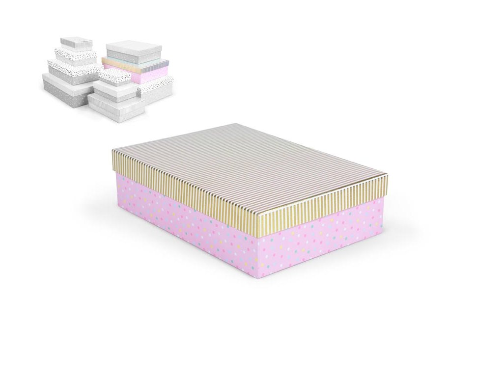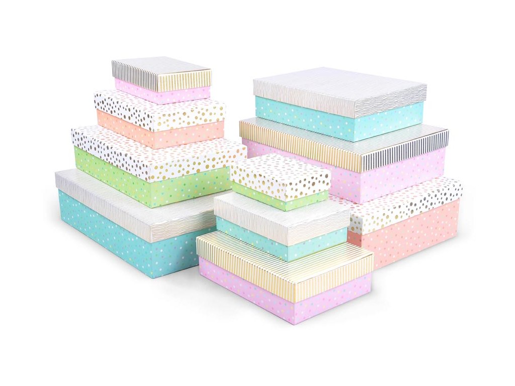 Celoročná darčeková krabička s rozmermi 33 x 23,5 x 9 cm NÁHODNÝ MIX Darčeková krabička v kombinácii pastelových farieb s rôznymi vzormi, ako sú bodky, prúžky alebo štruktúrovaný povrch. Vzory a farby sú zladené tak, aby vytvárali harmonický a elegantný vzhľad. Vhodná na slávnostné príležitosti, dekoratívne účely, balenie osobných darčekov alebo na uloženie rôznych drobností. Po pridaní jednej krabičky do košíka sa automaticky pridá celá súprava, ktorá obsahuje krabičky s rôznymi vzormi a veľkosťami. Táto variabilita Vám zaručuje, že máte k dispozícii krabičky vhodné na rôzne príležitosti a typy darčekov. Krabičky sú elegantne navrhnuté a navzájom ladia svojimi farbami a vzormi, čím vytvárajú harmonickú súpravu ideálnu na každú príležitosť. Materiál: 1,5 mm kartón, potiahnutý papierom s potlačou Súprava obsahuje tieto krabice: 5371135 Darčeková krabica D-L004-A 14,5x10x5cm 5371136 Darčeková krabica D-L004-B 17x12x5,5cm 5371137 Darčeková krabica D-L004-C 19x13,5x6cm 5371138 Darčeková krabica D-L004-D 22x16x6,5cm 5371139 Darčeková krabica D-L004-E 24,5x17,5x7cm 5371140 Darčeková krabica D-L004-F 27,5x19,5x7,5cm 5371141 Darčeková krabica D-L004-G 29x21x8cm 5371142 Darčeková krabica D-L004-H 33x23,5x9cm 5371143 Darčeková krabica D-L004-I 35x25x10cm 5371144 Darčeková krabica D-L004-J 37x27x11cm Uvedená cena je za 1 ks.Dodatočné parametre