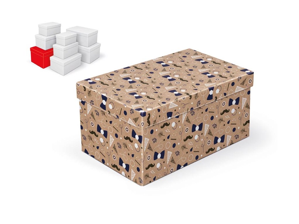 Celoročná darčeková krabica s rozmermi 28 x 18 x 14 cm NÁHODNÝ MIX Táto štýlová darčeková krabička v prírodnom tóne s motívom fúzikov, okuliarov a motýlikov zaujme na prvý pohľad. Ideálne pre pánske darčeky, tematické balenie alebo ako netradičné dekorácie. Spája originalitu s praktickosťou a hodí sa pre každého, kto ocenia vtip aj štýl. Krabička nie je samostatne predajná – pri vložení do košíka obdržíte celú sadu. Jednotlivé krabičky sa líšia veľkosťou aj vzorom, ale ladia do jedného hravého a zároveň elegantného celku. Skvele poslúži na balenie darčekov, uloženie drobností alebo ako zaujímavý doplnok do interiéru. Materiál: 1,5 mm kartón, potiahnutý papierom s potlačou Set obsahuje tieto krabice: 5371265 Škatuľa darčeková B-C011-A 16x10x8 cm 5371266 Škatuľa darčeková B-C011-B 18x11x9 cm 5371267 Škatuľa darčeková B-C011-C 20x12x10 cm 5371268 Krabica darčeková B-C011-D 22x14x11 cm 5371269 Krabica darčeková B-C011-E 24x16x12 cm 5371270 Škatuľa darčeková B-C011-F 26x17x13 cm 5371271 Krabica darčeková B-C011-G 28x18x14 cm 5371272 Krabica darčeková B-C011-H 30x19x15 cm Uvedená cena je za 1 ks.Dodatočné parametre