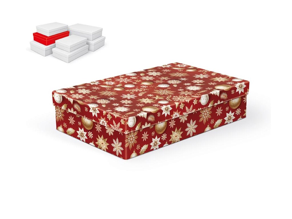Vianočná darčeková krabica s rozmermi 30 × 19 × 7 cm Vianočná darčeková krabica v červenom prevedení s bielymi a zlatými motívmi vločiek, hviezd a ozdôb rozžiari každý darček a dodá mu sviatočný nádych. Vďaka atraktívnemu vzhľadu sa stane ozdobou sama o sebe a podčiarkne kúzelnú atmosféru Vianoc. Vďaka svojej veľkosti je vhodná na balenie väčších darčekov, ako sú kozmetické kazety, módne doplnky, knihy alebo menšia elektronika. Po vložení krabice do košíka sa vždy objednáva sada 7 krabičiek v rovnakom vianočnom dizajne, líšiacich sa iba veľkosťou. Jednotlivé kusy nie je možné kúpiť samostatne. Materiál: 1,5 mm kartón, potiahnutý papierom s potlačou SET OBSAHUJE TIETO KRABICE: 5371301 Krabica darčeková A-V012-A 24×16×6 cm 5371302 Krabica darčeková A-V012-B 26×17×6 cm 5371303 Krabica darčeková A-V012-C 28×18×7 cm 5371304 Krabica darčeková A-V012-D 30×19×7 cm 5371305 Krabica darčeková A-V012-E 32×20×8 cm 5371306 Krabica darčeková A-V012-F 34×22×8 cm 5371307 Krabica darčeková A-V012-G 36×22×9 cm Uvedená cena je za 1 ks.Dodatočné parametre