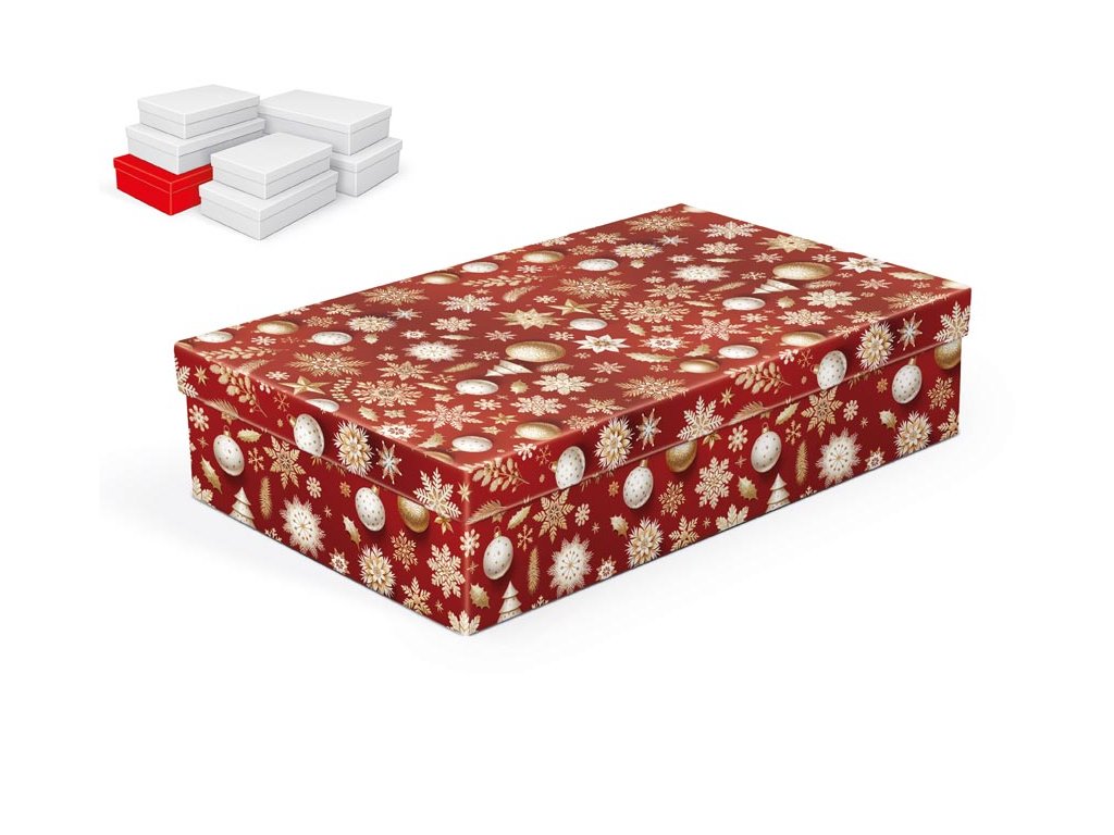 Vianočná darčeková krabica s rozmermi 34 × 22 × 8 cm Priestranná vianočná darčeková krabica v červenom prevedení so zlatými a bielymi motívmi vločiek, hviezd a ozdôb dodá každému daru slávnostný nádych a stane sa ozdobou pod stromčekom. Jej výrazný dizajn navodí skutočnú sviatočnú atmosféru a z balenia darčekov urobí radosť sama o sebe. Objednávka tejto položky zahŕňa vždy sadu 7 krabičiek rovnakého vianočného motívu v rôznych veľkostiach. Jednotlivo ju kúpiť nemožno. Materiál: 1,5 mm kartón, potiahnutý papierom s potlačou SET OBSAHUJE TIETO KRABICE: 5371301 Krabica darčeková A-V012-A 24×16×6 cm 5371302 Krabica darčeková A-V012-B 26×17×6 cm 5371303 Krabica darčeková A-V012-C 28×18×7 cm 5371304 Krabica darčeková A-V012-D 30×19×7 cm 5371305 Krabica darčeková A-V012-E 32×20×8 cm 5371306 Krabica darčeková A-V012-F 34×22×8 cm 5371307 Krabica darčeková A-V012-G 36×22×9 cm Uvedená cena je za 1 ks.Dodatočné parametre