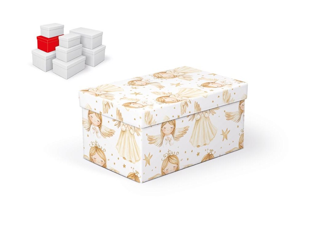 Vianočná darčeková krabica s rozmermi 22 × 14 × 11 cm Vianočná darčeková krabička je zdobená motívom anjelikov a zlatých hviezdičiek, ktoré jej dodávajú jemný a elegantný vzhľad. Vďaka pevnému prevedeniu sa stáva nielen praktickým obalom, ale aj krásnou súčasťou samotného darčeka. Už pri odovzdaní tak pôsobí každý darček výnimočne a premyslene. Po vložení do košíka sa automaticky pridáva celá sada ôsmich krabičiek v rôznych veľkostiach, všetky v rovnakom dizajne. Samostatný predaj nie je možný – vždy ide iba o kompletné balenie celej sady. Materiál: 1,5 mm kartón, potiahnutý papierom s potlačou SET OBSAHUJE TIETO KRABICE: 5371308 Krabica darčeková B-V011-A 16×10×8 cm 5371309 Krabica darčeková B-V011-B 18×11×9 cm 5371310 Krabica darčeková B-V011-C 20×12×10 cm 5371311 Krabica darčeková B-V011-D 22×14×11 cm 5371312 Krabica darčeková B-V011-E 24×16×12 cm 5371313 Krabica darčeková B-V011-F 26×17×13 cm 5371314 Krabica darčeková B-V011-G 28×18×14 cm 5371315 Krabica darčeková B-V011-H 30×19×15 cm Uvedená cena je za 1 ks.Dodatočné parametre
