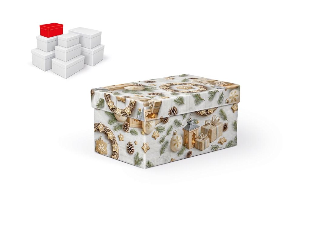 Vianočná darčeková krabica s rozmermi 18 × 11 × 9 cm Vianočná darčeková krabička s motívom prírodných dekorácií, šišiek a zlatých ozdôb je krásnym riešením pre každého, kto chce mať darček zabalený rýchlo, jednoducho a zároveň štýlovo. Prírodný motív doplnený o zlaté detaily vytvára elegantný a nadčasový dizajn, ktorý sa hodí ku každému vianočnému darčeku. Krabičku nie je možné zakúpiť jednotlivo – po vložení do košíka sa vždy objednáva kompletná sada ôsmich kusov v rôznych veľkostiach s rovnakým motívom. Materiál: 1,5 mm kartón, potiahnutý papierom s potlačou SET OBSAHUJE TIETO KRABICE: 5371316 Krabica darčeková B-V012-A 16×10×8 cm 5371317 Krabica darčeková B-V012-B 18×11×9 cm 5371318 Krabica darčeková B-V012-C 20×12×10 cm 5371319 Krabica darčeková B-V012-D 22×14×11 cm 5371320 Krabica darčeková B-V012-E 24×16×12 cm 5371321 Krabica darčeková B-V012-F 26×17×13 cm 5371322 Krabica darčeková B-V012-G 28×18×14 cm 5371323 Krabica darčeková B-V012-H 30×19×15 cm Uvedená cena je za 1 ks.Dodatočné parametre