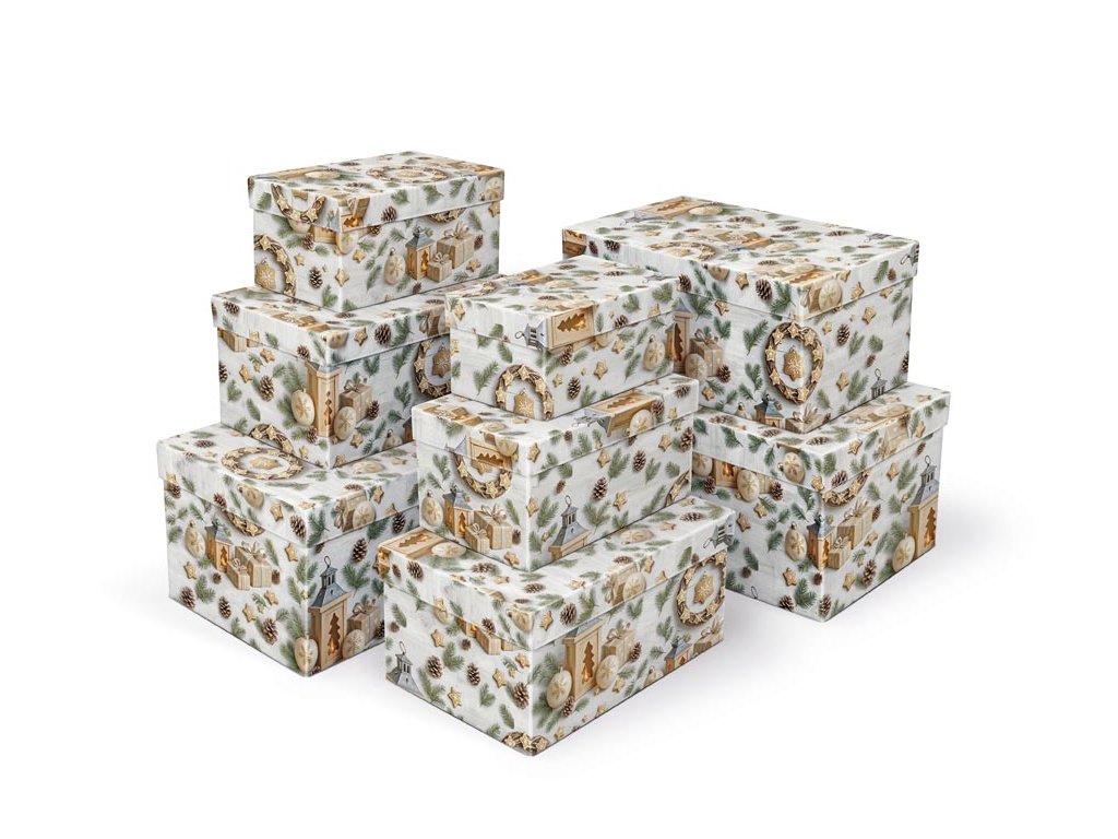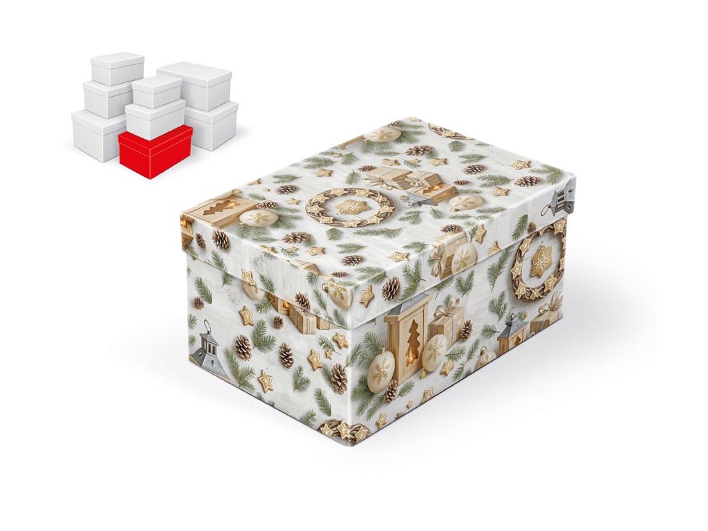 Vianočná darčeková krabica s rozmermi 24 × 16 × 12 cm Balenie darčekov môže byť jednoduché aj krásne. Papierová krabička s vekom a vianočným motívom prírodných dekorácií, šišiek a zlatých ozdôb dodá darčeku sviatočný nádych a postará sa o to, aby bol bezpečne uložený. Tento produkt sa predáva iba ako sada ôsmich krabičiek. Všetky majú rovnaký vianočný motív, ale každá inú veľkosť. Objednaním teda kupujete celé balenie 8 kusov, ktoré pokryje balenie drobností aj väčších darčekov. Jednotlivé krabičky samostatne dostupné nie sú. Materiál: 1,5 mm kartón, potiahnutý papierom s potlačou SET OBSAHUJE TIETO KRABICE: 5371316 Krabica darčeková B-V012-A 16×10×8 cm 5371317 Krabica darčeková B-V012-B 18×11×9 cm 5371318 Krabica darčeková B-V012-C 20×12×10 cm 5371319 Krabica darčeková B-V012-D 22×14×11 cm 5371320 Krabica darčeková B-V012-E 24×16×12 cm 5371321 Krabica darčeková B-V012-F 26×17×13 cm 5371322 Krabica darčeková B-V012-G 28×18×14 cm 5371323 Krabica darčeková B-V012-H 30×19×15 cm Uvedená cena je za 1 ks.Dodatočné parametre