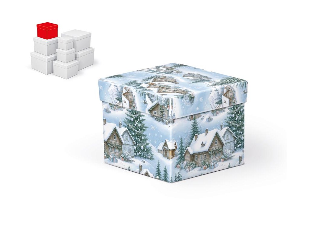 Vianočná darčeková krabica s rozmermi 12 × 12 × 10 cm Krabička s motívom zimnej dedinky pôsobí útulne a pripomína kúzlo tradičných Vianoc. Zasnežené strechy chalúpok, ozdobené stromčeky a drobné vločky vytvárajú hrejivú atmosféru, vďaka ktorej sa aj obyčajný darček premení na milé prekvapenie. Je ideálna na balenie menších predmetov, ktoré chcete odovzdať jednoducho, ale zároveň s dôrazom na detail a krásu. Tento produkt je vždy dodávaný ako sada ôsmich krabičiek s rovnakým motívom. Jednotlivé krabičky sa líšia veľkosťou, takže spolu tvoria praktický a zladený komplet na balenie drobností aj väčších darčekov. Do košíka sa preto vždy vkladá celá sada, jednotlivé kusy samostatne dostupné nie sú. Materiál: 1,5 mm kartón, potiahnutý luxusným papierom SET OBSAHUJE TIETO KRABICE: 5371324 Krabica darčeková vianočná C-V010-A 8×8×8 cm 5371325 Krabica darčeková vianočná C-V010-B 10×10×9 cm 5371326 Krabica darčeková vianočná C-V010-C 12×12×10 cm 5371327 Krabica darčeková vianočná C-V010-D 14×14×11 cm 5371328 Krabica darčeková vianočná C-V010-E 16×16×12 cm 5371329 Krabica darčeková vianočná C-V010-F 18×18×13 cm 5371330 Krabica darčeková vianočná C-V010-G 20×20×14 cm 5371331 Krabica darčeková vianočná C-V010-H 22×22×15 cm Uvedená cena je za 1 ks.Dodatočné parametre