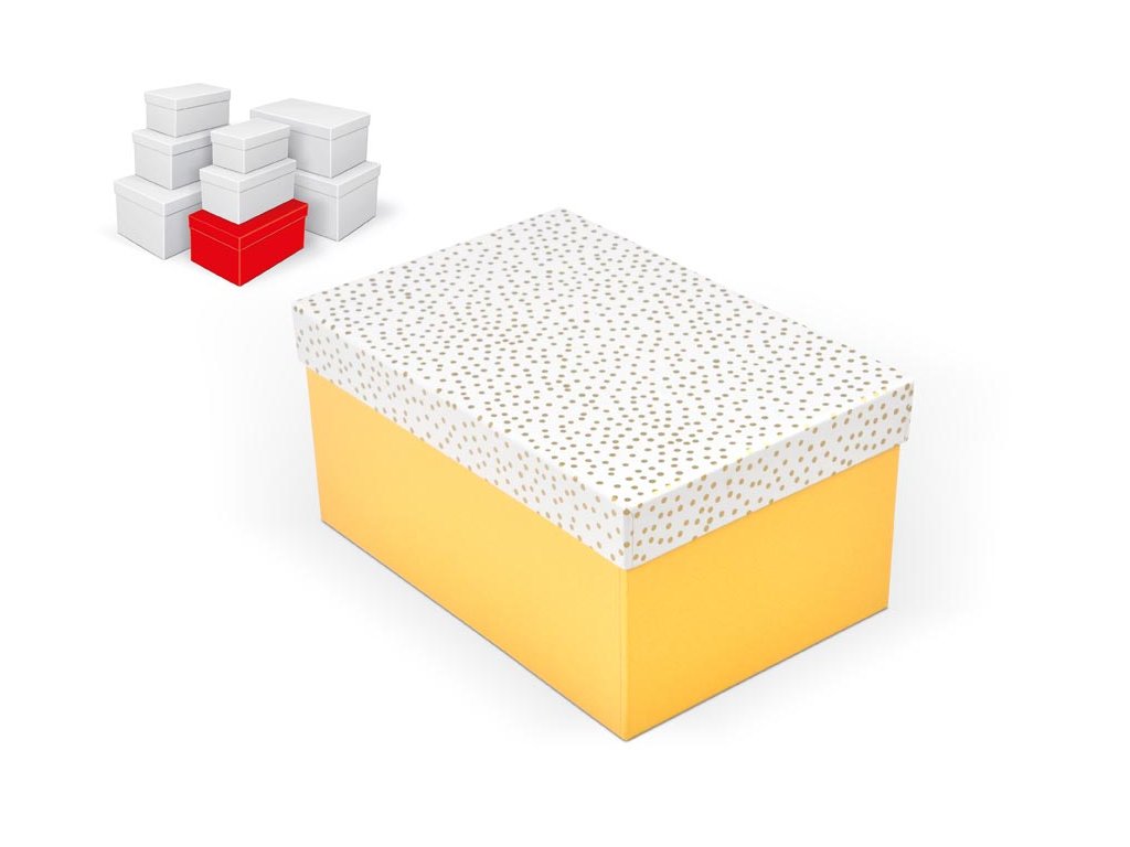 Celoročná darčeková krabica s rozmermi 24 × 16 × 12 cm NÁHODNÝ MIX Slnečný dizajn s jemným detailom Žiarivo žlté dno v kombinácii s bielym vekom posiatym drobnými zlatými bodkami pôsobí sviežo, hravo a zároveň elegantne. Ideálna voľba pre každého, kto chce darček zabaliť s radosťou a vkusom. Poslúži nielen ako elegantný obal na darček, ale aj ako krásna schránka na vaše poklady, spomienky alebo ručne vyrábané radosti. Do košíka sa automaticky pridáva celá sada 8 rôznych darčekových krabičiek. Farebné prevedenie sa môže líšiť – krabička nemusí mať vždy rovnaké farby ako na fotografii. Motívy a kombinácie sa v sadách náhodne striedajú naprieč veľkosťami, vďaka čomu je každý set originálny. Materiál: 1,5 mm kartón, potiahnutý papierom s potlačou SET OBSAHUJE TIETO KRABICE: 5371332 Krabica darčeková B-C012-A 16×10×8 cm 5371333 Krabica darčeková B-C012-B 18×11×9 cm 5371334 Krabica darčeková B-C012-C 20×12×10 cm 5371335 Krabica darčeková B-C012-D 22×14×11 cm 5371336 Krabica darčeková B-C012-E 24×16×12 cm 5371337 Krabica darčeková B-C012-F 26×17×13 cm 5371338 Krabica darčeková B-C012-G 28×18×14 cm 5371339 Krabica darčeková B-C012-H 30×19×15 cm Uvedená cena je za 1 ks.Dodatočné parametre