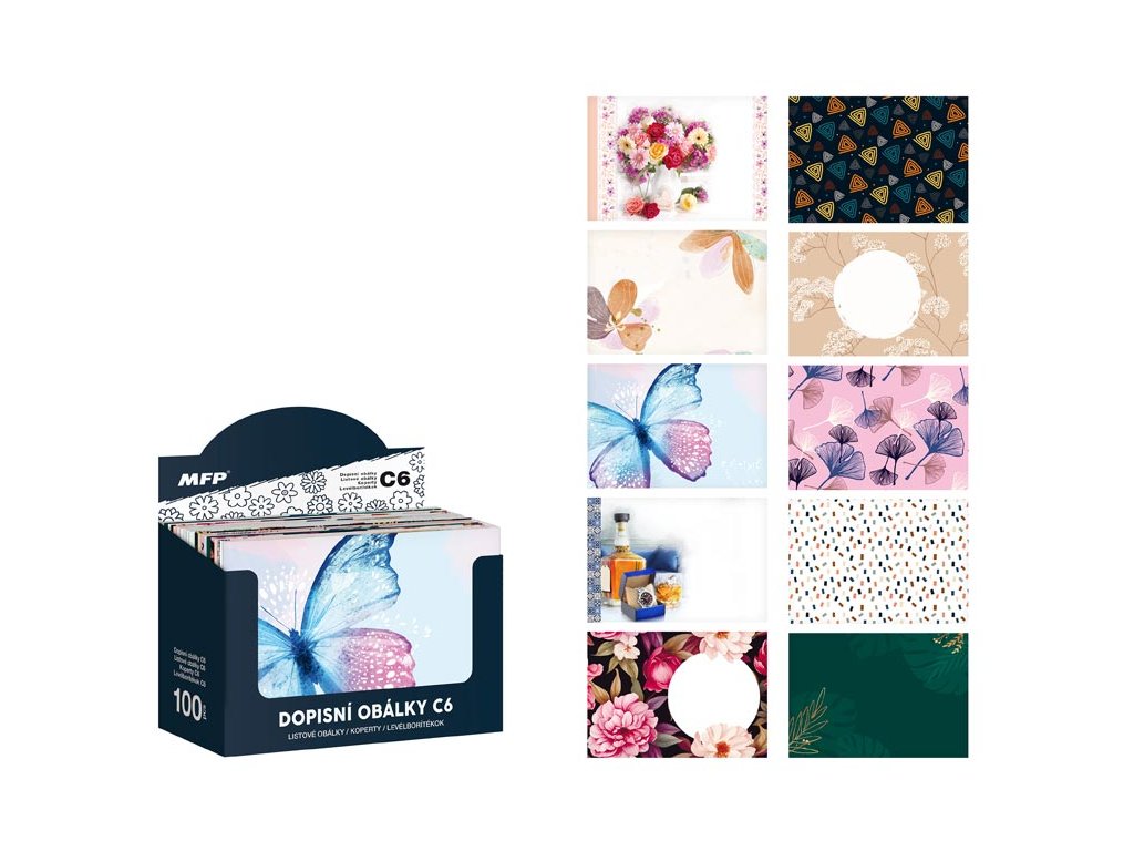Celoplošne potlačené listové obálky C6 s krycou páskou. – Radi posielate listy? Zaobstarajte si u nás listové obálky a nezabudnite si u nás kúpiť aj listový papier a pero! Vybrať si môžete z 10 rôznych potlačí (viď obrázok). Uvedená cena je za 1 ks. Dodávame v mixe po 20 ks. Obálky sú uložené v plastovom vrecku.Dodatočné parametre