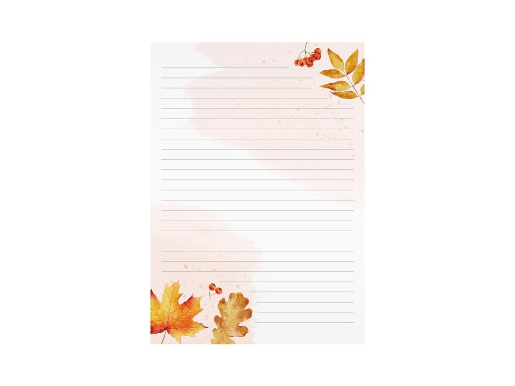 Listová súprava s jesenným motívom padajúcich listov a jarabín. Píšete radi listy svojim známym? Kúpte si u nás krásne listové papiere s rôznymi motívmi a nezabudnite ani na písacie potreby. BALENIE OBSAHUJE: - 10 potlačených listových papierov formátu A4 - 5 farebných poštových obálok FORMÁT: A4 PREVEDENIE: linajkový Balené v plastovom priehľadnom obale so závesom. Uvedená cena je za 1 balenie.Dodatočné parametre