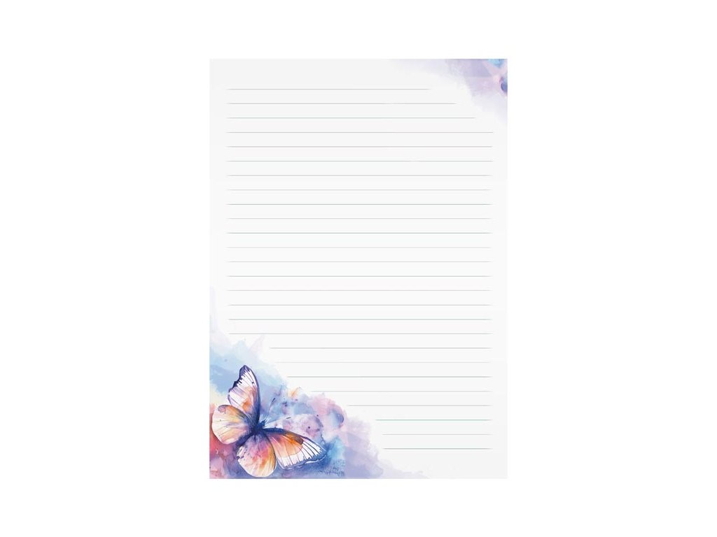 Jemnosť na každom liste! Ľahký motív motýľa dodá vášmu písaniu jemnosť, eleganciu a osobitý štýl. Vaše slová vďaka nemu získajú ľahkosť a krásu, ktorá poteší každého príjemcu. BALENIE OBSAHUJE: - 10 potlačených listových papierov formátu A4 - 5 farebných poštových obálok formátu C6 FORMÁT: A4 MOTIV: motýľ PREVEDENIE: linajkový Balené v plastovom priehľadnom obale so závesom. Uvedená cena je za 1 balenie.Dodatočné parametre