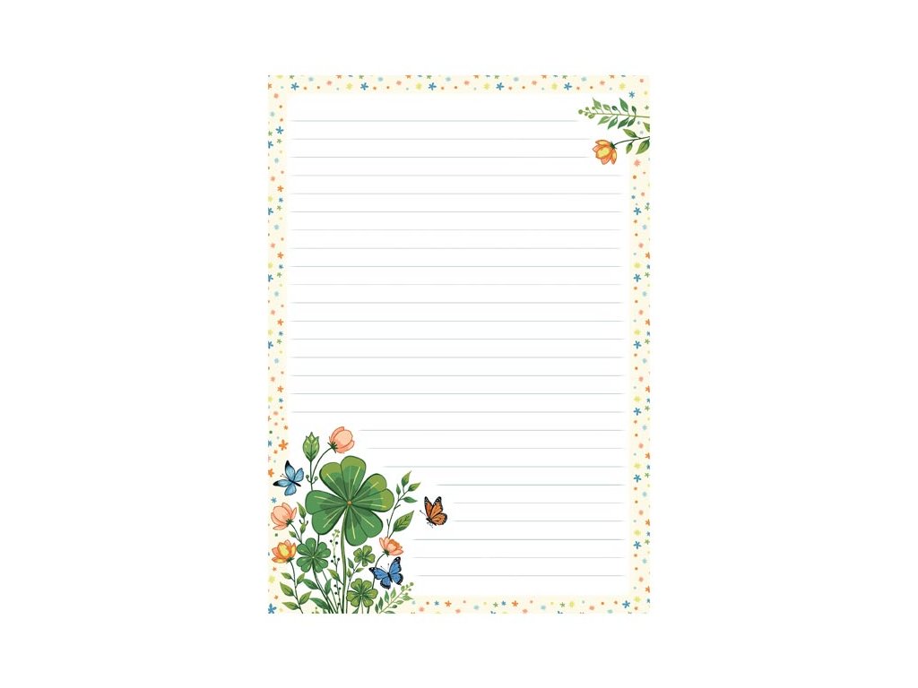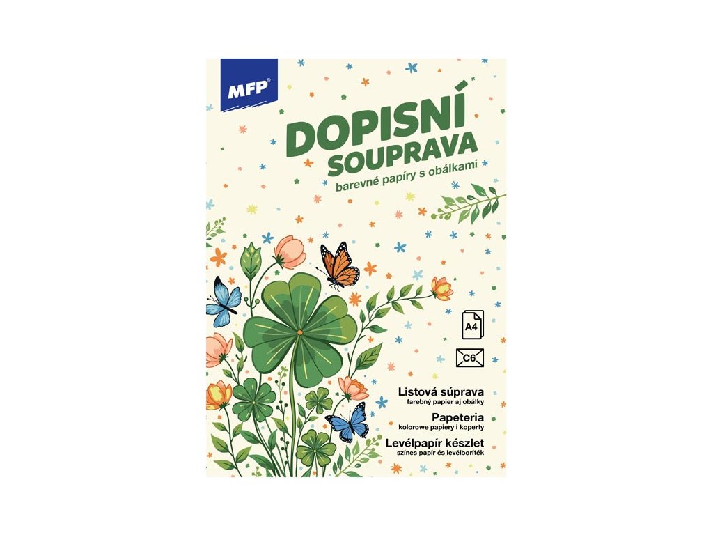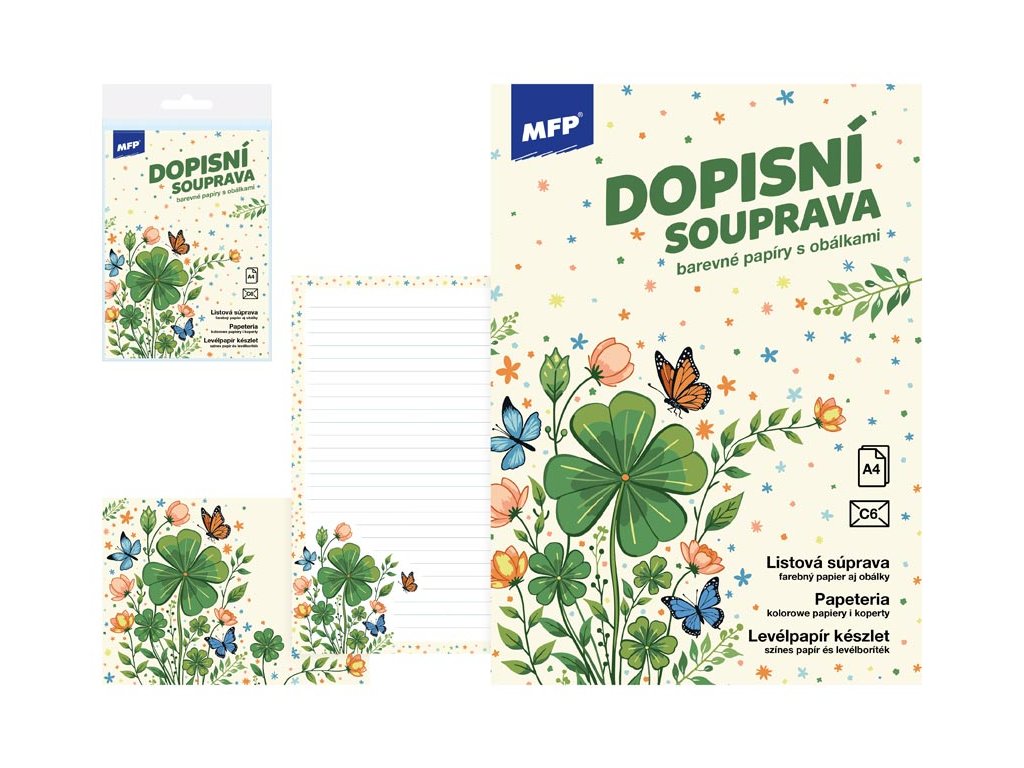 Písanie pre šťastie! Listová sada s motívom štvorlístkov, kvetov a motýľov dodá vášmu písaniu jemnosť a sviežosť. Vaše slová tak získajú ľahkosť a kúzlo prírody, ktoré potešia každého, kto váš list otvorí. BALENIE OBSAHUJE: - 10 potlačených listových papierov formátu A4 - 5 farebných poštových obálok formátu C6 FORMÁT: A4 MOTIV: štvorlístok PREVEDENIE: linajkový Balené v plastovom priehľadnom obale so závesom. Uvedená cena je za 1 balenie.Dodatočné parametre