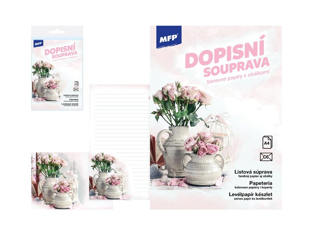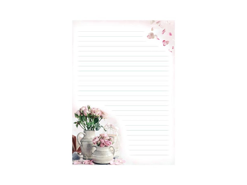 Keď obyčajný papier nestačí! Elegantná listová súprava s jemným motívom ružových ruží v rustikálnych vázach vdýchne každému vášmu listu kúzlo a osobitosť. Farebné linkované papiere a ladiace obálky v nežných ružových tónoch sú ideálne na písanie osobných odkazov, prianí i slávnostných listov. BALENIE OBSAHUJE: - 10 potlačených listových papierov formátu A4 - 5 farebných poštových obálok formátu C6 FORMÁT: A4 MOTIV: kvety PREVEDENIE: linajkový Balené v plastovom priehľadnom obale so závesom. Uvedená cena je za 1 balenie.Dodatočné parametre