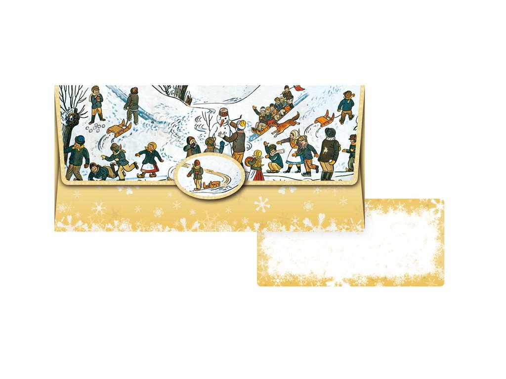 Darčeková obálka na peniaze s vianočným motívom a s uzatvárateľnou klapkou. Darujte svojim blízkym darček k Vianociam v podobe obálky na peniaze. Do obálky môžete vložiť peniaze alebo darčekovú poukážku. Vo vnútri je kartička bez textu, na ktorú môžete napísať venovanie. Motív: motívy Jozefa Ladu Dodávame v plastovom obale so závesom. Uvedená cena je za 1 ks.Dodatočné parametre