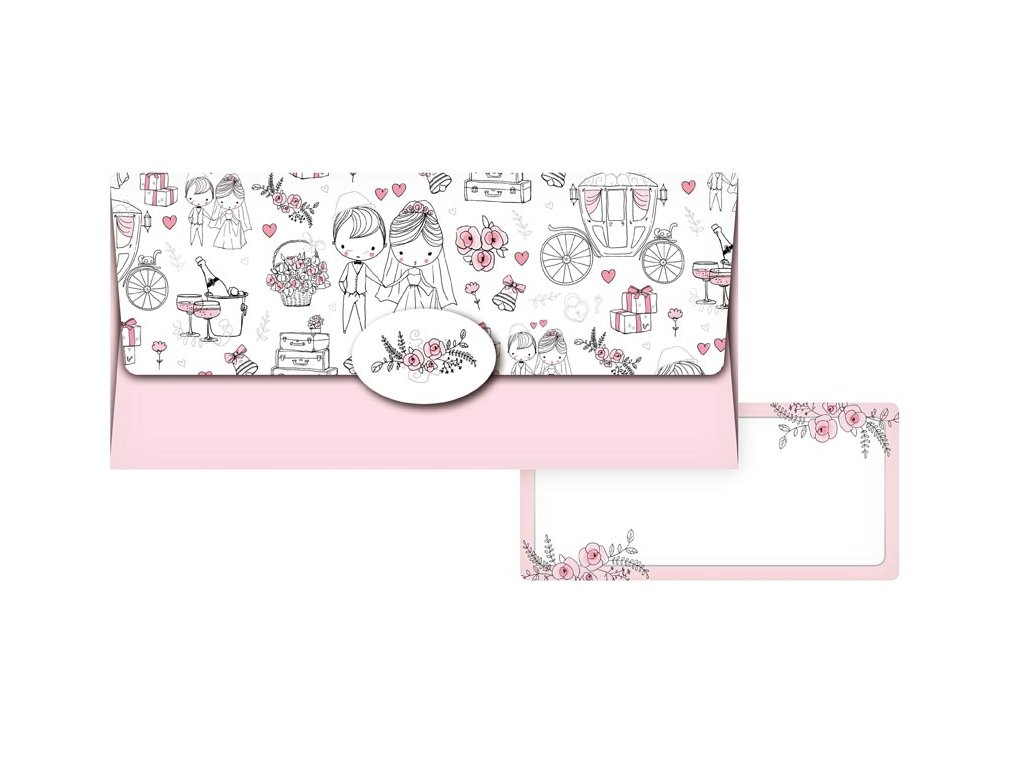 Darčeková obálka na peniaze pre novomanželov – Urobte novomanželom radosť a venujte im obálku s peniazmi alebo darčekovým poukazom. Vnútri je kartička bez textu, na ktorú môžete napísať venovanie. PREVEDENIE: bielo ružová obálka s obrázkami Dodávame v plastom vrecku so závesom. Uvedená cena je za 1 ks.Dodatočné parametre