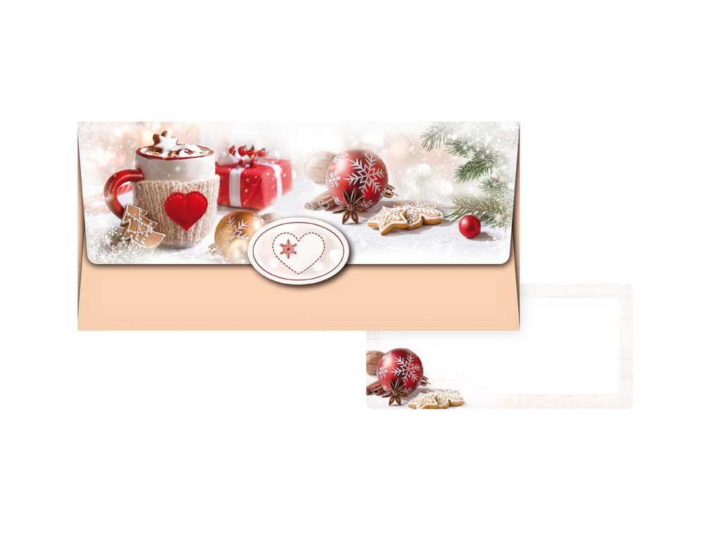 Darčeková obálka na peniaze s vianočným motívom a uzatvárateľnou chlopňou. Obdarujte svojich blízkych na Vianoce obálkou na peniaze. Do obálky môžete vložiť peniaze alebo darčekovú poukážku. Vo vnútri je kartička bez textu, na ktorú môžete napísať venovanie. Farba: béžová/biela Motív: Vianoce Dodávame v plastom vrecku so závesom. Uvedená cena je za 1 ks.Dodatočné parametre