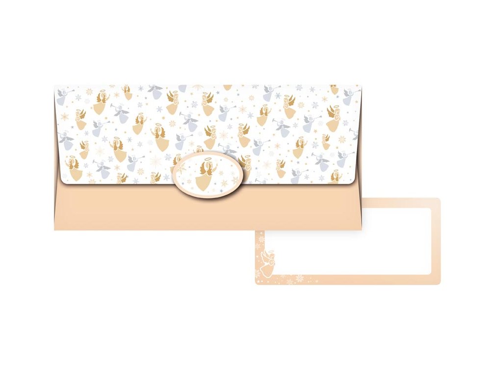 Darčeková obálka na peniaze s vianočným motívom anjelov a uzatvárateľnou chlopňou. Je ideálny na darčekové účely, kedy chcete peniaze odovzdať elegantným a vkusným spôsobom. Vnútri je kartička bez textu, na ktorú môžete napísať venovanie. MOTIV: anjeli Dodávame v plastovom sáčku. Uvedená cena je za 1 ks.Dodatočné parametre