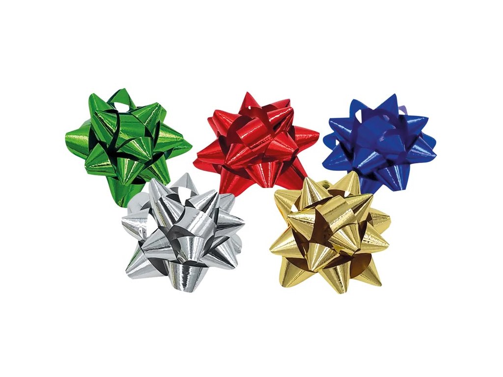 Rozetka v mixe metalických farieb. Ideálne pre moderné ozdobenie darčeka. Rozetka má na spodnej strane lepiacu pásku pomocou ktorej ju pripevníte na krabičku. Balenie: 50 ks Priemer: 50 mm Šírka stuhy: 10 mm Farba: strieborná, zlatá, zelená, modrá, červená Všetkých 50 ks je balených v sáčku. Dodávame v mixe farieb podľa skladovej zásoby. Uvedená cena je za 1 ks.Dodatočné parametre