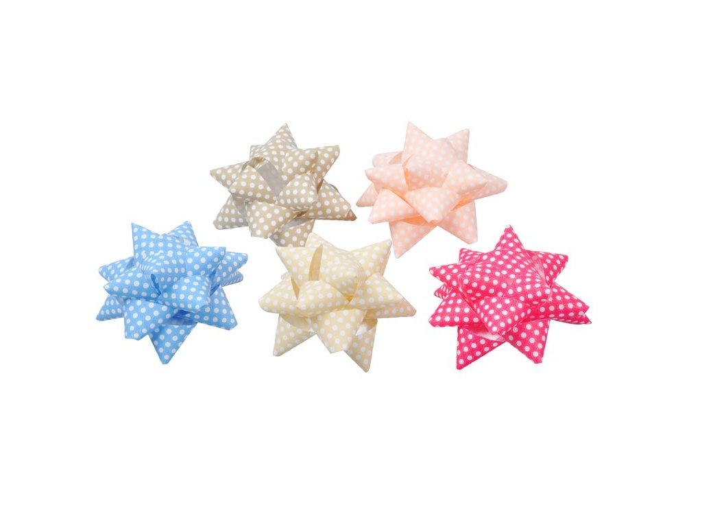 Rozetka v zmesi farieb s bielymi bodkami. Táto moderná ozdoba dodá vašim darčekom šmrnc a eleganciu. Vďaka praktickému lepiacemu prúžku na spodnej strane ju môžete ľahko pripevniť na akúkoľvek darčekovú krabičku. Ideálna na každú príležitosť, keď chcete urobiť radosť a nezabudnuteľný dojem. Balenie: 30 ks Priemer: 90 mm Šírka stuhy: 20 mm Všetkých 30 ks je zabalených v sáčku. Dodávame v mixe farieb podľa skladových zásob. Uvedená cena je za 1 ks.Dodatočné parametre