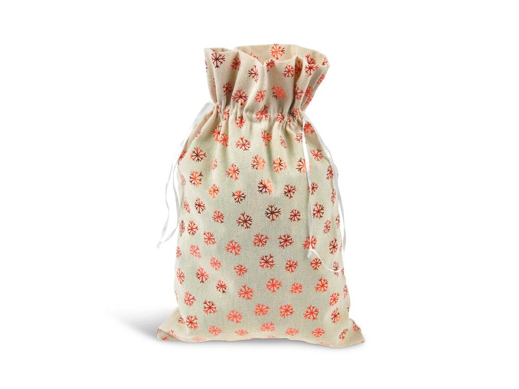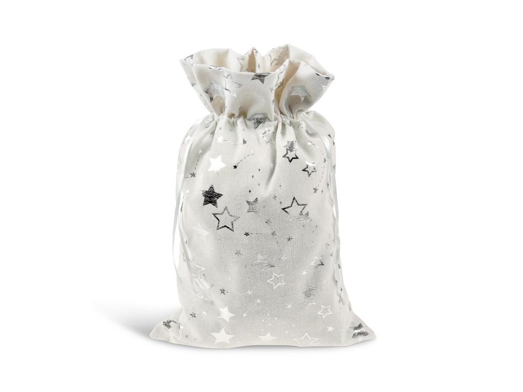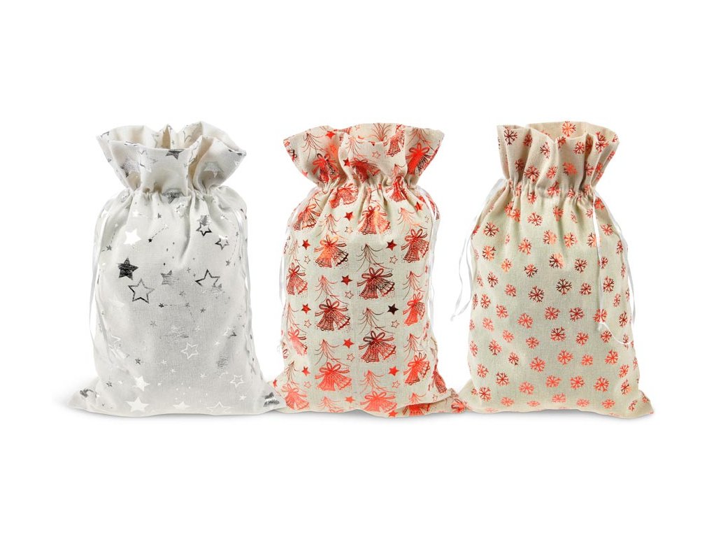 Vianočné, látkové, darčekové vrecúško s vianočnými motívmi. Darujte vianočný darček originálne. Je ideálny na zabalenie drobného darčeka, perníčkov, orieškov alebo sušeného ovocia. Vrecko má zatváranie na sťahovaciu stužku. Balenie: 12 ks Farba: béžová, biela Rozmer: 250 x 390 mm Motív: hviezdy, zvončeky, vločky Dodávame v mixe po 3 ks podľa skladovej zásoby. Uvedená cena je za 1 ks.Dodatočné parametre