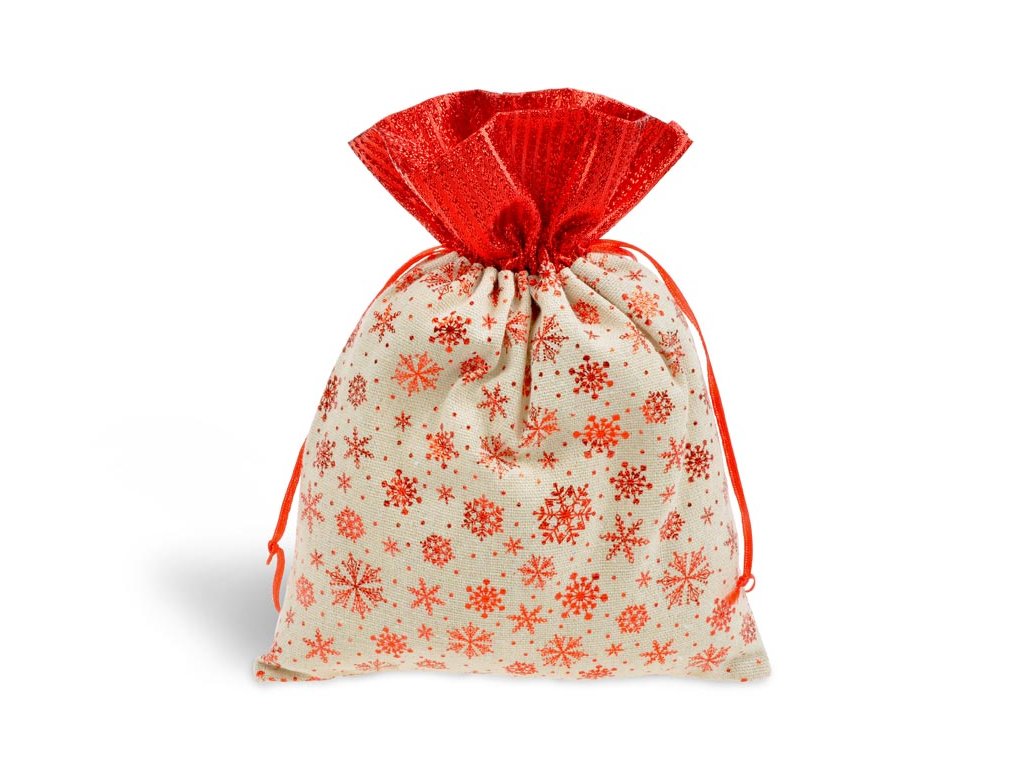 Vianočné látkové darčekové vrecúško s motívom vločiek. Darujte vianočný darček originálne. Je ideálny na zabalenie drobného darčeka, perníčkov, orieškov alebo sušeného ovocia. Vrecko má zatváranie na sťahovaciu stužku. Motív: vločky Materiál: juta Balenie: 12 ks Farba: hnedá/červená Rozmer: 180 x 230 mm Uvedená cena je za 1 ks.Dodatočné parametre