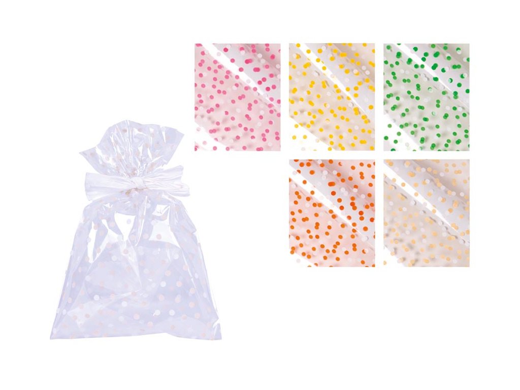 Priehľadné číre celofánové vrecúško s potlačou farebných bodiek. Skvelé na zabalenie malých darčekov. Vrecúško môžete uzavrieť viazacou stuhou a tým ho dozdobiť. Ponúkame veľký výber stúh a roziet, ktoré vám pomôžu pri dekorácii balíčka. Motív: bodky Farba: priehľadná Rozmer: 200 x 320 mm Dodávame v mixe 5 ks podľa skladovej zásoby. Uvedená cena je za 1 ks.Dodatočné parametre