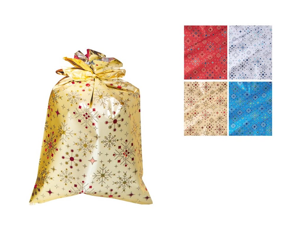 Vianočné darčekové vrecko, vyrobené z lesklého materiálu s dekoratívnou potlačou snehových vločiek a hviezdičiek. Umožňuje ľahko zabaliť rôzne druhy drobných darčekov bez nutnosti použitia baliaceho papiera. Praktický a elegantný spôsob balenia, ktorý šetrí čas aj námahu. Vrecko môžete uzavrieť viazacou stuhou a tým ho dozdobiť. Materiál: polypropylén Rozmer: 350 x 500 mm Motív: snehové vločky, hviezdičky Farba: červená, strieborná, zlatá, modrá Dodávame v mixe po 4 ks podľa skladovej zásoby. Uvedená cena je za 1 ks.Dodatočné parametre