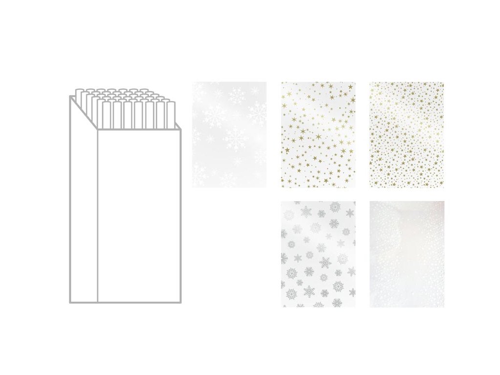 Celofán transparentný s vianočnou potlačou. Je vhodný na balenie darčekových košov, darčekov a ako výplň darčekových krabičiek. Balenie: 50 ks Farba: transparentná Motív: hviezdy, vločky Veľkosť rolky: 700 x 5000 mm. Všetkých 50 ks je balených v kartónovej krabici. Dodávame v mixe podľa skladovej zásoby. Uvedená cena je za 1 ks.Dodatočné parametre