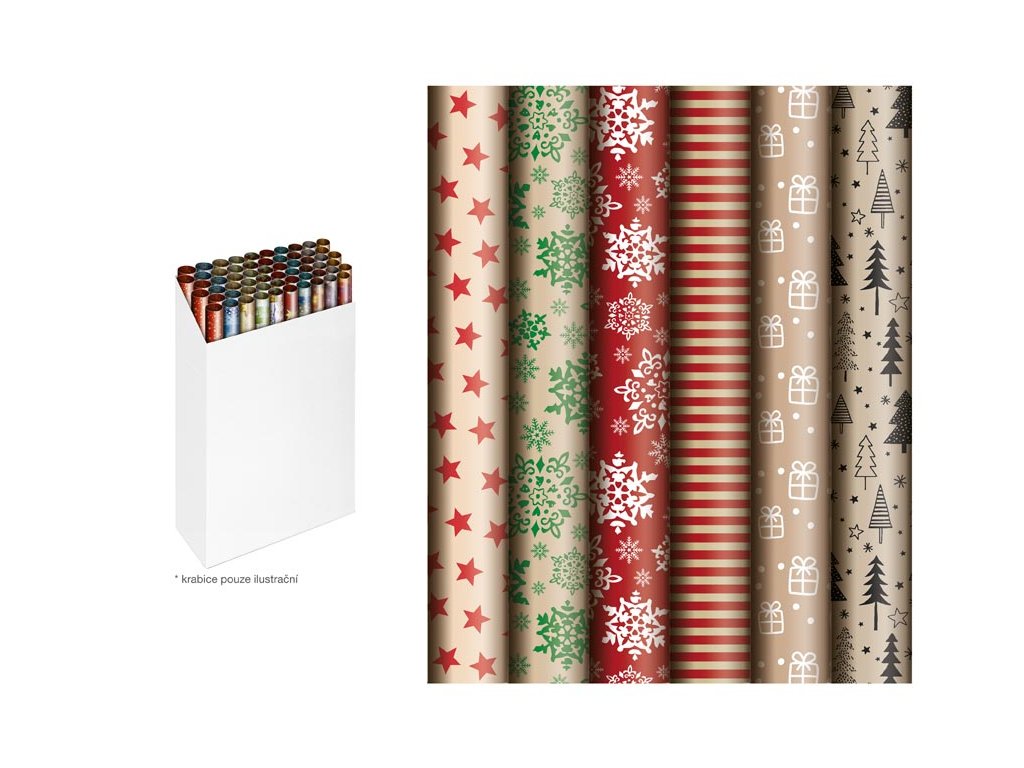 Vianočný, baliaci, kraftový papier v mixe 6 motívov. Obsah vianočných darčekov je veľmi dôležitý, ale aj to, ako je darček zabalený. Získajte u nás vianočný, darčekový, baliaci papier s rôznymi motívmi. Nezabudnite kúpiť peknú stuhu a menovky na darček. Hmotnosť: 70 g Balenie: 50 ks Motív: mix vianočných motívov Materiál: kraftový papier Rozmer rolky: 500 x 700 mm Všetkých 50 kusov je zabalených v kartónovej krabici. Dodávame v mixe podľa skladových zásob. Uvedená cena je za 1 ks.Dodatočné parametre