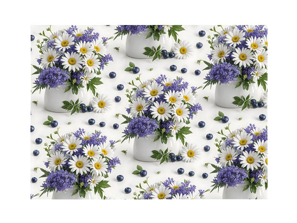 Celoročný baliaci papier LUX s motívom kvetinového aranžmánu, ktorý zahŕňa kytice margarétok a fialových kvetov vo vázičkách. Je vhodný na rôzne príležitosti, ako sú narodeniny, sviatky, výročia alebo bežné darovanie. U nás nájdete všetko, čo potrebujete na dokonalé zabalenie darčekov - od baliaceho papiera až po stužky a menovky. Balenie: 25 ks Gramáž: 80 g Motív: kvety Rozmer archu: 1000 x 700 mm Všetkých 25 ks je balených v sáčku. Uvedená cena je za 1 ks.Dodatočné parametre