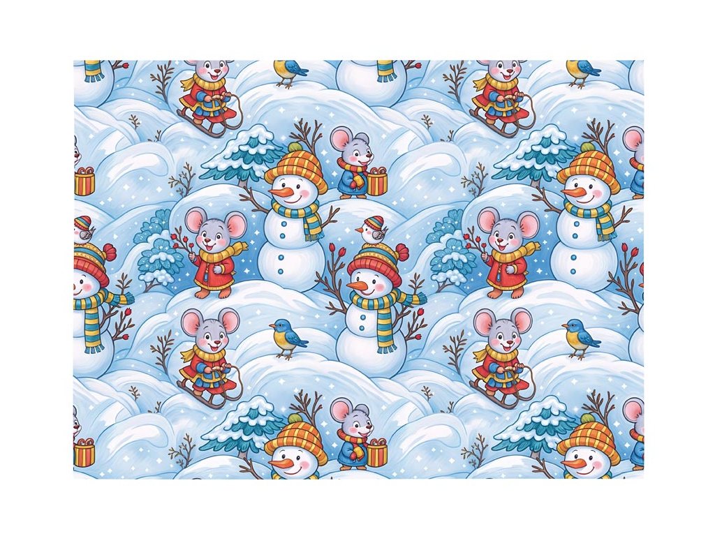 Veselá zima plná radosti! Čarovný svet plný snehuliakov, myšiek v kabátikoch a farebných vtáčikov, ktorí sa preháňajú medzi zasneženými kopcami – to všetko prináša vianočný baliaci papier Klasik. Hravý dizajn s ilustráciami v jemných pastelových farbách pôsobí optimisticky, priateľsky a detsky nežne – ideálna voľba pre rodinné Vianoce alebo balenie darčekov pre najmenších. Či už s ním zabalíte hračku, knižku alebo sladké prekvapenie, výsledok bude vždy roztomilý a štýlový. Ak chcete potešiť deti i dospelých úsmevom ešte pred rozbalením, tento papier bude trefa do čierneho. Gramáž: 70 g Balenie: 150 ks Motív: snehuliaci, myšky Rozmer archu: 1000 x 700 mm Všetkých 150 ks je balených v sáčku v kartónovej krabici. Uvedená cena je za 1 ks.Dodatočné parametre