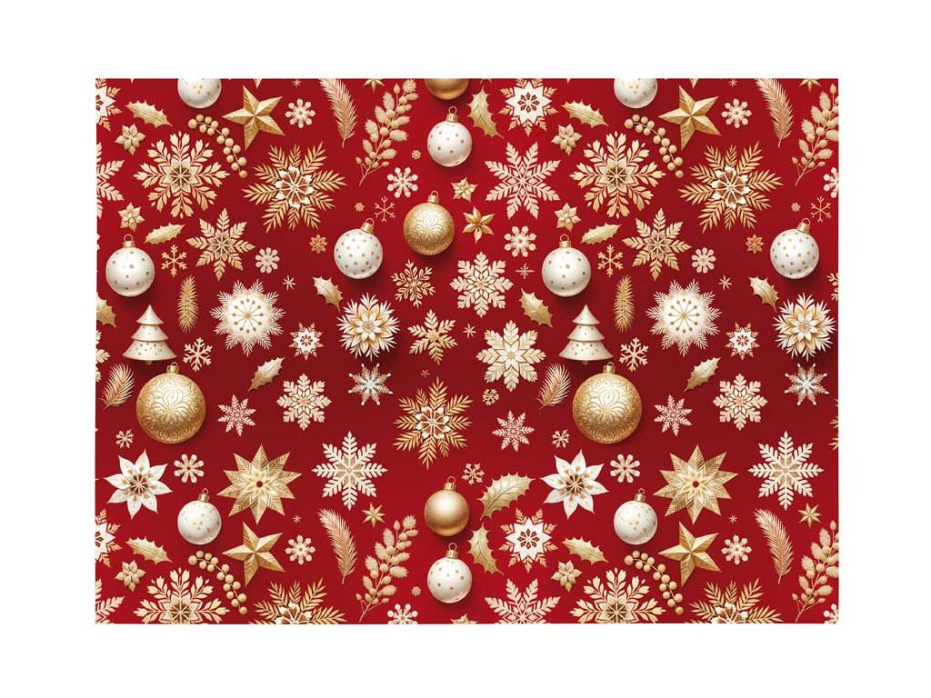Elegantná vianočná klasika! Sýtočervený podklad a bohaté zlaté motívy – snehové vločky, vianočné gule, vetvičky aj jemné detaily, ktoré dýchajú sviatočnou atmosférou. Práve tento dojem v sebe nesie baliaci papier z rady Klasik, ktorý spája tradíciu, vkus a štipku luxusu a premení každý darček na skutočnú ozdobu Vianoc. Upúta na prvý pohľad, dodá darčekom štýl a podčiarkne celkový dojem starostlivosti a pozornosti. Ideálny pre tých, ktorí si potrpia na krásne detaily a chcú potešiť už samotným balením. Gramáž: 70 g Balenie: 150 ks Rozmer archu: 1000 x 700 mm Motív: snehové vločky, vianočné gule Všetkých 150 ks je balených v sáčku v kartónovej krabici. Uvedená cena je za 1 ks.Dodatočné parametre