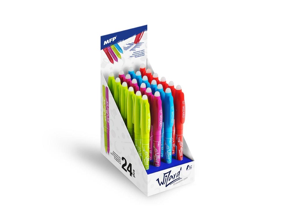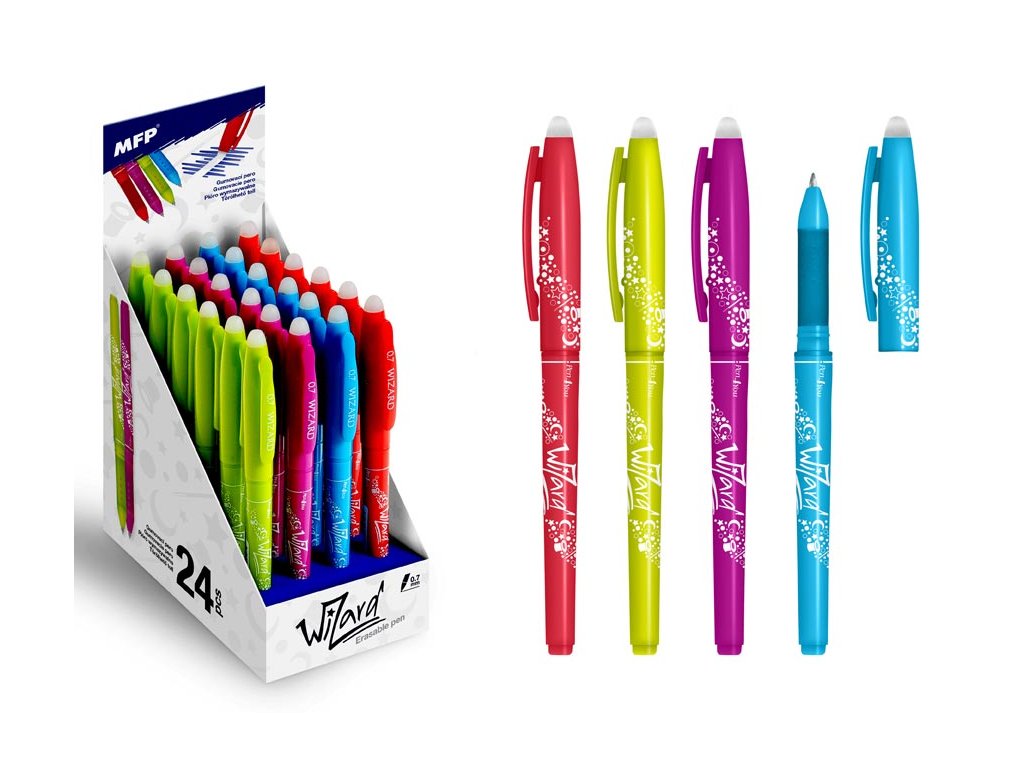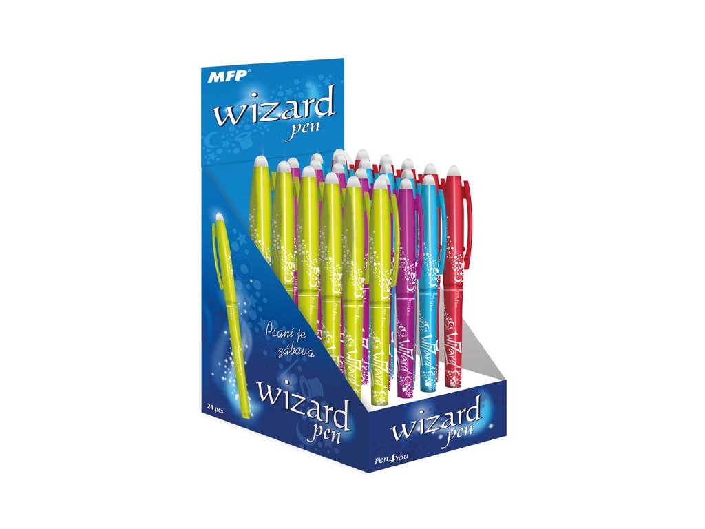 Magické, guľôčkové pero Wizard obsahuje špeciálny atrament tzv. vymaž a prepíš, alebo vymaž a nechaj znovu objaviť. Ak urobíte chybu, stačí len pero otočiť a plastovou špičkou text vymažete. Špička zahreje atrament, ten zmizne a je možné ho znova prepísať. Môžete si písať i tajné odkazy, po vygumovaní stačí len papier ochladiť pod bod mrazu a text sa znovu objaví. Toto vygumovateľné pero je balené po 24 ks v praktickom papierovom stojane. Podávame v mixe 4 farieb podľa skladových zásob. Prečítajte si, na akom princípe funguje gumovacie pero Wizard! Dĺžka: 142 mm Náplň: 0,7 mm Náplň: 5400186 Počet ks v balení: 24 ks Prevedenie: s vŕškom Farba: čierna, modrá, zelená, fialová Táto vymazateľná pera sú balená po 24 ks v praktickom papierovom stojane. Dodávame v mixe 4 farieb podľa skladovej zásoby. Uvedená cena je za 1 ks.Dodatočné parametre