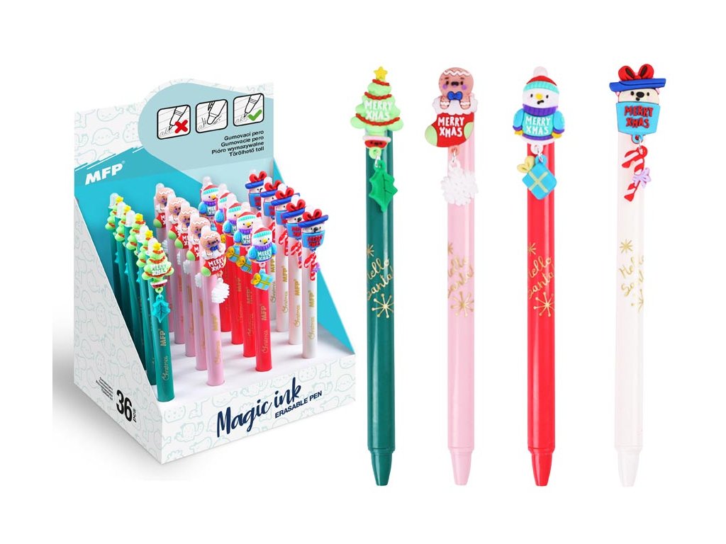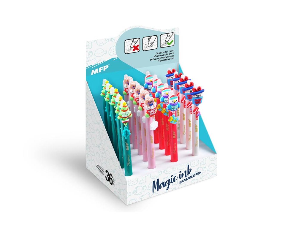 Gumovacie, guľôčkové pero s motívom Vianoc. Obsahuje špeciálny atrament, tzv. vymaž a prepíš, alebo vymaž a nechaj to znova objaviť. Ak urobíte chybu, stačí len otočiť pero a plastovou špičkou text vymažete. Špička zahreje atrament, ten zmizne a môžeš to znova prepísať. Môžete si písať aj tajné odkazy, po vygumovaní stačí len papier schladiť pod bod mrazu a text sa znovu objaví. Toto vymazateľné pero je balené v papierovom stojane po 20 ks. Prečítajte si, na akom princípe funguje gumovacie pero Wizard! Náplň: 0,5 mm Motív: Vianoce Náplň: 5400196 modrá Počet kusov v balení: 20 ks Prevedenie: stláčací mechanizmus Dodávame v mixe po 4 ks podľa skladovej dostupnosti. Uvedená cesta je za 1 ks.Dodatočné parametre