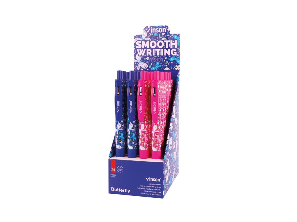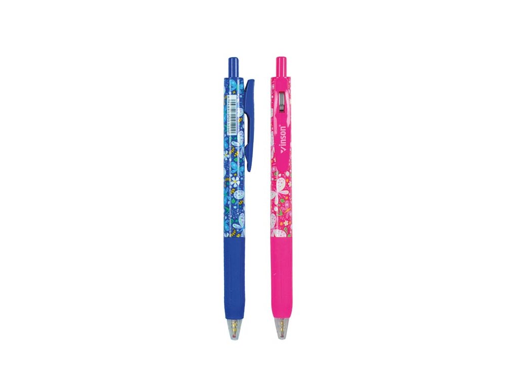Plastové, guľôčkové pero VSN 520 s klipom a atramentom na olejovej báze. Tento atrament poskytuje veľmi pohodlné písanie a rýchlo schne. Vhodné na použitie v škole, kancelárii aj v domácnosti. Gélové pero má pogumovaný úchop, a tak zabraňuje skĺznutiu v ruke. Hrot: 0,7 mm Dĺžka: 140 mm Farba: modrá, ružová Motív: kvety, motýliky Počet kusov v balení: 24 ks Prevedenie: stláčací mechanizmus Dodávame v mixe 2 kusov podľa skladovej zásoby. Uvedená cena je za 1 ks.Dodatočné parametre