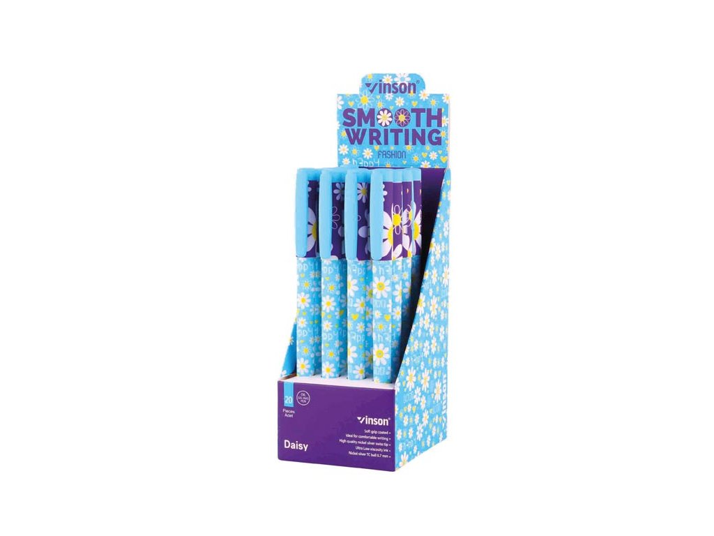 Plastové, guľôčkové pero VSN A26 s uzáverom a atramentom na olejovej báze. Tento olejový atrament poskytuje veľmi pohodlné písanie a rýchlo schne. Vhodné na použitie v škole, kancelárii aj v domácnosti. Hrot: 0,7 mm Farba: modrá Motív: margarétky Prevedenie: s uzáverom Počet kusov v balení: 20 ks Uvedená cena je za 1 ks.Dodatočné parametre