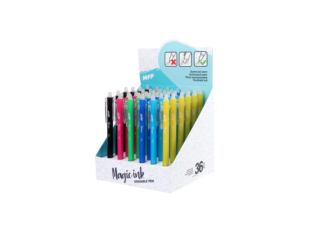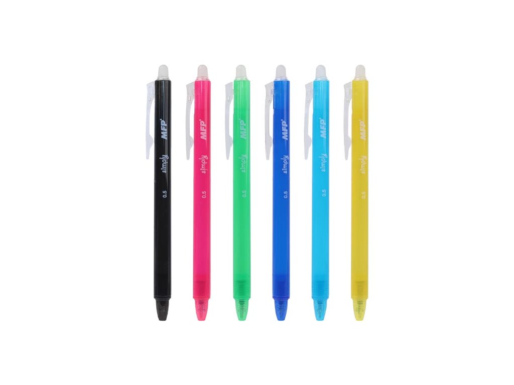 Guľôčkové pero 0,5 mm Simply s gumovým hrotom. Pero má modrú náplň a gumový hrot uľahčuje vymazanie chyby. Môžete dokonca písať tajné správy, po vymazaní stačí papier ochladiť pod bodom mrazu a text sa opäť objaví. Náplň: 0,5 mm Počet kusov v balení: 36 ks Náplň: 5400196 modrá gélová Prevedenie: stláčací mechanizmus Farba: čierna, ružová, zelená, tmavomodrá, svetlomodrá, žltá Dodávame v mixe 6 farieb podľa skladovej zásoby. Uvedená cena je za 1 ks.Dodatočné parametre