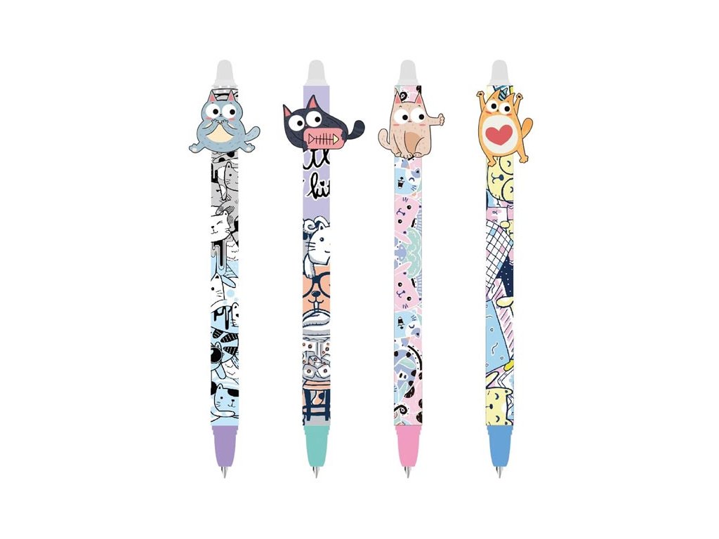Gumovacie guľôčkové pero s motívmi mačiek obsahuje špeciálny atrament s názvom vymaž a prepíš alebo vymaž a nechaj znovu objaviť. Ak urobíte chybu, stačí pero otočiť a plastovým hrotom text vymazať. Hrot zahreje atrament, ten zmizne a dá sa znova napísať. Môžete dokonca písať tajné správy, po vymazaní stačí papier ochladiť pod bod mrazu a text sa znovu objaví. Toto gumovacie pero je balené v papierovom stojane po 20 ks. Prečítajte si, na akom princípe funguje gumovacie pero Wizard! Motív: mačky Náplň: 0,5 mm Počet kusov v balení: 36 ks Náplň: 5400196 modrá gélová Prevedenie: stláčací mechanizmus Dodávame v mixe po 4 ks podľa skladovej dostupnosti. Uvedená cena je za 1 ks.Dodatočné parametre
