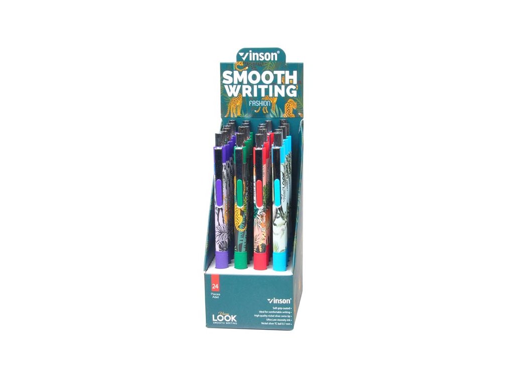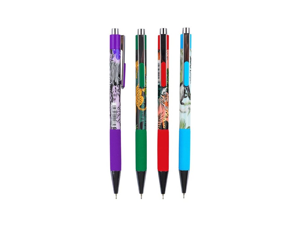 Guľôčkové pero v kombinácii farieb a motívov s 0,7 mm hrotom, ktorý zaručuje jemné a presné písanie. Pero je naplnené špeciálnym atramentom na olejovej báze, ktorý zlepšuje plynulosť písania a zároveň zabraňuje rozmazávaniu. Telo pera je zdobené rôznymi vzormi inšpirovanými divokými zvieratami, ako sú zebra, gepard, tiger alebo nosorožec. Mechanizmus pera je klikací, s kovovými koncovkami na oboch koncoch. Tento model pera je ideálny pre tých, ktorí majú radi kreatívne a farebné písacie nástroje s prírodnými motívmi. Hrot: 0,7 mm Počet kusov v balení: 24 ks Dizajn: stláčací mechanizmus Motív: zebra, gepard, tiger, nosorožec Farba: fialová, zelená, červená, modrá Dodávame v mixe po 4 ks podľa skladových zásob. Uvedená cena je za 1 ks.Dodatočné parametre