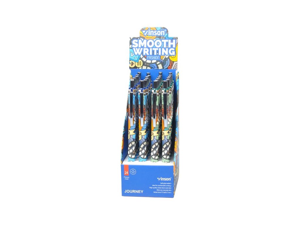 Guľôčkové pero s výrazným farebným dizajnom plným rôznych grafických motívov a textov. Pero je vybavené 0,7 mm hrotom na jemné a presné písanie. Je vybavené náplňou so špeciálnym atramentom na olejovej báze, ktorý zlepšuje plynulosť písania a zároveň zabraňuje rozmazávaniu. Ideálne na každodenné používanie v kancelárii, škole alebo doma. Hrot: 0,7 mm Počet kusov v balení: 24 ks Konštrukcia: stláčací mechanizmus Dodávame v mixe 2 ks podľa skladových zásob. Uvedená cena je za 1 ks.Dodatočné parametre