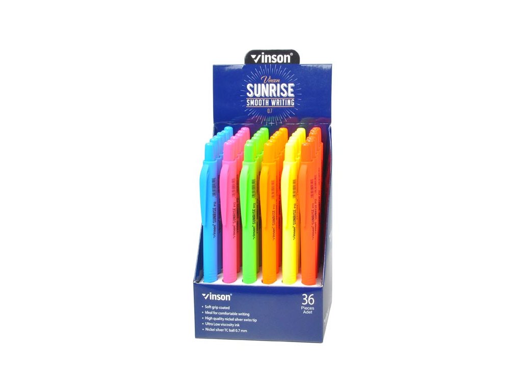 Guľôčkové pero, ktoré je k dispozícii v kombinácii žiarivých farieb s 0,7 mm hrotom, zaručuje hladké a presné písanie. Pero je naplnené špeciálnym atramentom na olejovej báze, ktorý zlepšuje plynulosť písania a zároveň zabraňuje rozmazávaniu. Ideálne na každodenné používanie v kancelárii, škole alebo doma. Hrot: 0,7 mm Počet kusov v balení: 36 ks Konštrukcia: stláčací mechanizmus Farba: modrá, neónovo ružová, neónovo zelená, neónovo oranžová, neónovo žltá, oranžová Dodávame v mixe po 6 ks podľa skladových zásob. Uvedená cena je za 1 ks.Dodatočné parametre