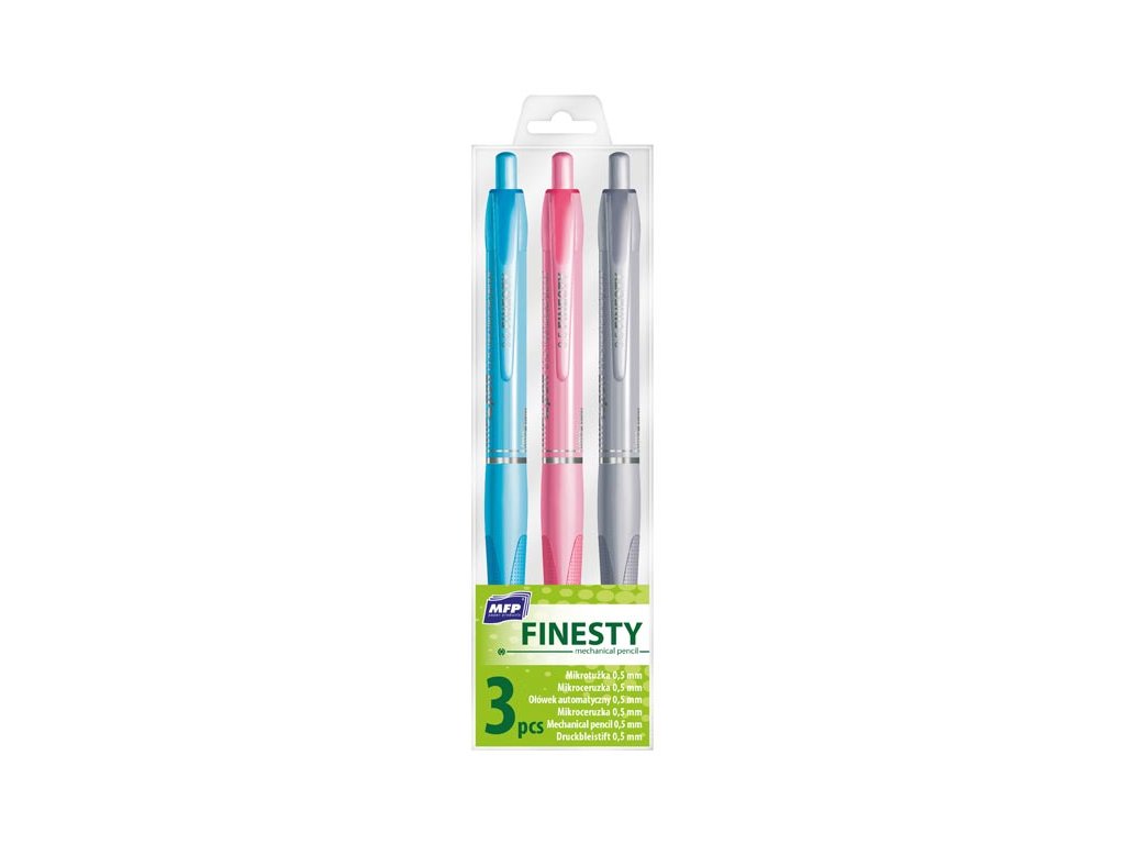 Súprava 3 ks mechanických mikroceruziek značky Finesty, tzv. pentelky s tuhou 0,5 mm. V hornej časti ceruzky sa nachádza pod vrchnáčikom stieracia guma. Ceruzka je opatrená plastovým klipom. Farba: Modrá, ružová, sivá Dĺžka: 150 mm Priemer tuhy: 0,5 mm Ceruzky sú zabalené vo vrecku so závesom. Uvedená cena je za 1 balenie.Dodatočné parametre