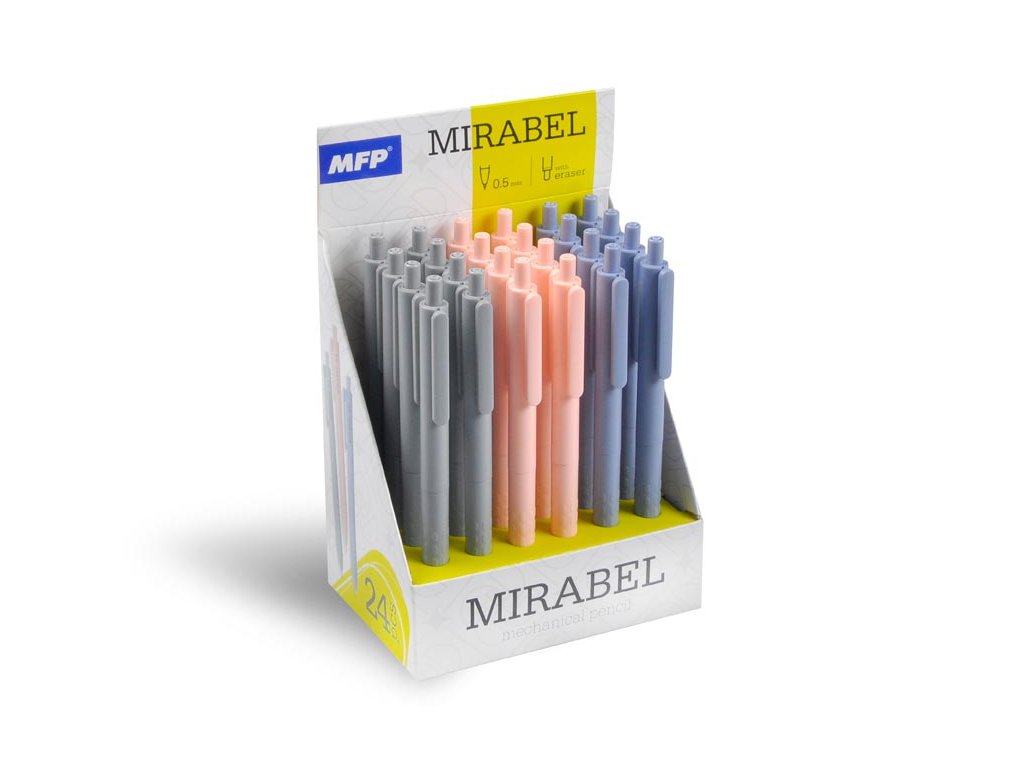 Keď rozhodujú detaily! Mikrotužka Mirabel zaujme jednoduchým moderným dizajnom v jemných pastelových farbách. Je vyrobená z ľahkého plastu a v oblasti úchopu má jemné vrúbkovanie, ktoré zabezpečuje pohodlné a isté držanie aj pri dlhšom písaní. Praktický stláčací mechanizmus uľahčuje ovládanie a pod horným krytom sa nachádza integrovaná guma – ideálna na drobné opravy vždy po ruke. Hrúbka hrotu 0,5 mm zaručuje presné a čisté písanie, vhodné do školy, kancelárie aj na doma. Hrúbka hrotu: 0,5 mm Farba: ružová, sivá, modrá Dodávame v mixe 3 farieb podľa aktuálnej skladovej dostupnosti. Cena je uvedená za 1 ks.Dodatočné parametre