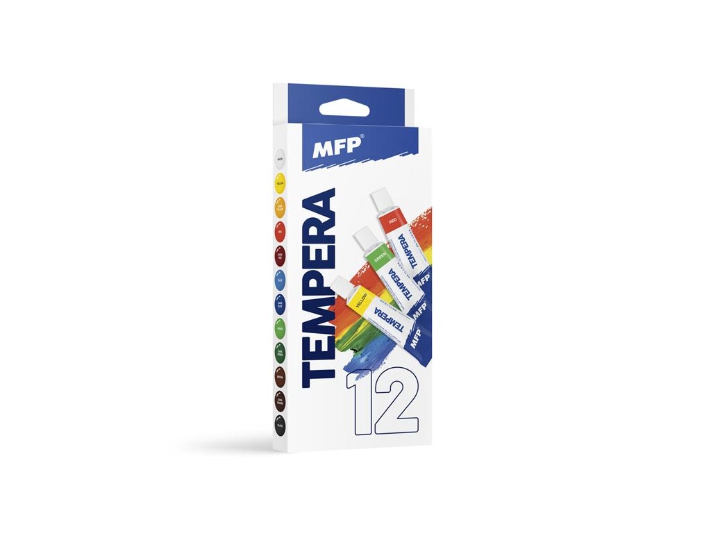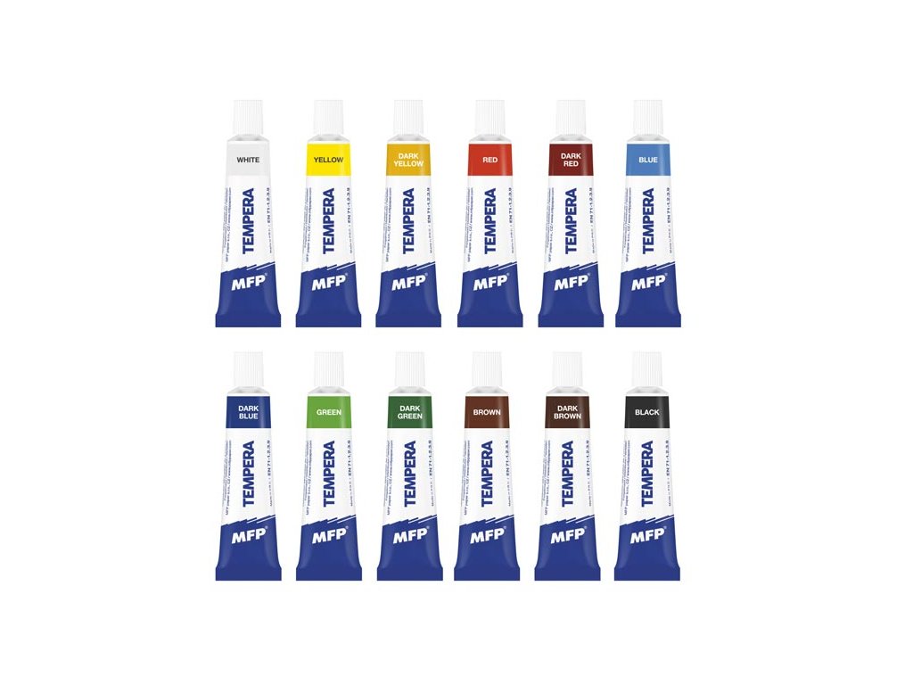 Súprava temperových farieb MFP. Namaľujte si s deťmi obrázok pomocou temperových farieb, ktoré vynikajú jasnou farebnosťou. Deti môžu maľovať štetcom, ale aj prstami. - vysoké krycie vlastnosti - žiadne toxické látky - pre školské a hobby použitie - tempery sú v hliníkovej tube BALENIE OBSAHUJE: - 12 ks farieb - svetlo modrá, tmavo modrá, svetlo zelená, tmavo zelená, svetlo žltá, tmavo žltá, svetlo červená, tmavo červená, svetlo hnedá, tmavo hnedá, biela, čierna Obsah farby v jednej tube: 12 ml VAROVANIE: Nevhodné pre deti do 3 rokov. Nebezpečenstvo prehltnutia malých častí. EN71 - 1,2,3,9 Dodávame v papierovej krabičke. Uvedená cena je za 1 balenie.Dodatočné parametre