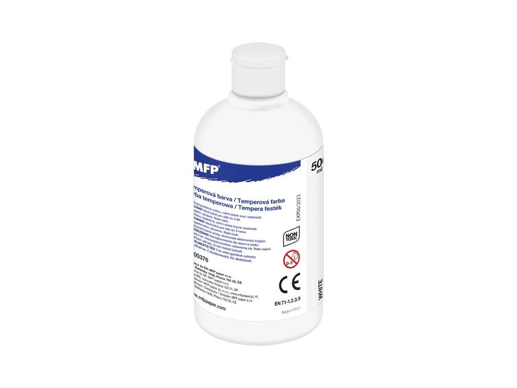 Temperové farby MFP 500 ml – biela. Temperové farby sú pripravené k okamžitému maľovaniu, ľahko sa používajú a miešajú. Ľahko sa vyperú z väčšiny textílií, ale je dobré pred praním škvrny prečistiť ručným mydlom. Vysoká hodnota pigmentu vo farbe zaručuje maximálnu kryciu vlastnosť a kvalitu. Farby sú vynikajúco odolné proti vyblednutiu. Vďaka väčšiemu baleniu sú tieto farby vhodné pre školy, škôlky a rôzne umelecké krúžky. Farba: biela Obsah farby v jednej fľaštičke: 500 ml VAROVANIE: Nevhodné pre deti do 3 rokov. Nebezpečenstvo prehltnutia malých častí. EN71 – 1,2,3,9 Uvedená cena je za 1 tubu.Dodatočné parametre