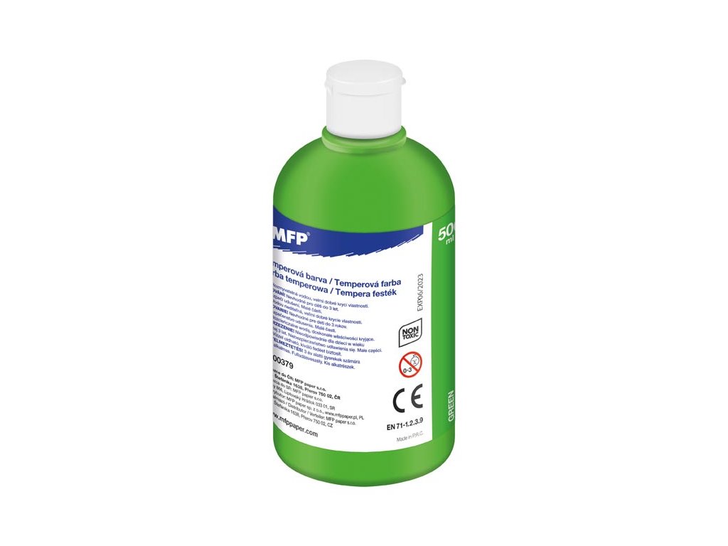 Temperové farby MFP 500 ml – svetlozelená. Temperové farby sú pripravené k okamžitému maľovaniu, ľahko sa používajú a miešajú. Ľahko sa vyperú z väčšiny textílií, ale je dobré pred praním škvrny prečistiť ručným mydlom. Vysoká hodnota pigmentu vo farbe zaručuje maximálnu kryciu vlastnosť a kvalitu. Farby sú vynikajúco odolné proti vyblednutiu. Vďaka väčšiemu baleniu sú tieto farby vhodné pre školy, škôlky a rôzne umelecké krúžky. Farba: svetlozelená Obsah farby v jednej fľaštičke: 500 ml VAROVANIE: Nevhodné pre deti do 3 rokov. Nebezpečenstvo prehltnutia malých častí. EN71 – 1,2,3,9 Uvedená cena je za 1 tubu.Dodatočné parametre