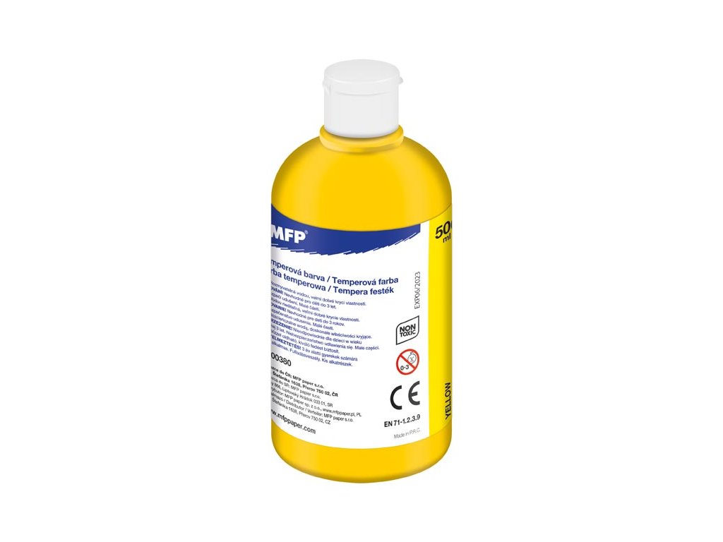 Temperové farby MFP 500 ml – žltá. Temperové farby sú pripravené k okamžitému maľovaniu, ľahko sa používajú a miešajú. Ľahko sa vyperú z väčšiny textílií, ale je dobré pred praním škvrny prečistiť ručným mydlom. Vysoká hodnota pigmentu vo farbe zaručuje maximálnu kryciu vlastnosť a kvalitu. Farby sú vynikajúco odolné proti vyblednutiu. Vďaka väčšiemu baleniu sú tieto farby vhodné pre školy, škôlky a rôzne umelecké krúžky. Farba: žltá Obsah farby v jednej fľaštičke: 500 ml VAROVANIE: Nevhodné pre deti do 3 rokov. Nebezpečenstvo prehltnutia malých častí. EN71 – 1,2,3,9 Uvedená cena je za 1 tubu.Dodatočné parametre