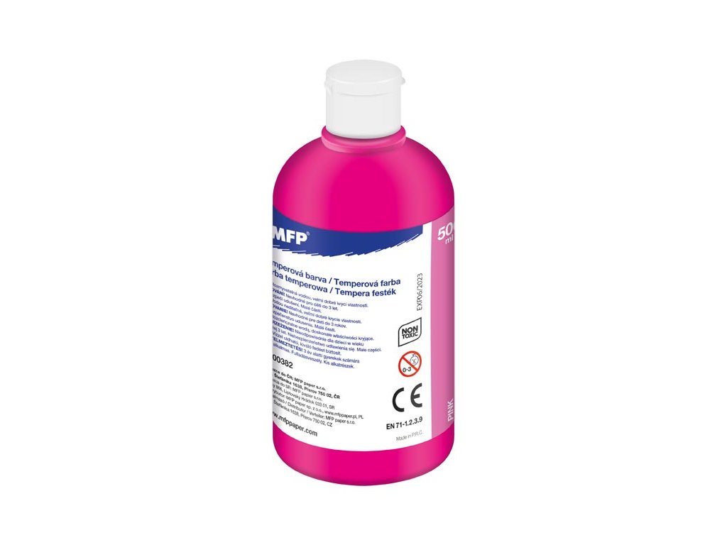 Temperové farby MFP 500 ml – ružová. Temperové farby sú pripravené k okamžitému maľovaniu, ľahko sa používajú a miešajú. Ľahko sa vyperú z väčšiny textílií, ale je dobré pred praním škvrny prečistiť ručným mydlom. Vysoká hodnota pigmentu vo farbe zaručuje maximálnu kryciu vlastnosť a kvalitu. Farby sú vynikajúco odolné proti vyblednutiu. Vďaka väčšiemu baleniu sú tieto farby vhodné pre školy, škôlky a rôzne umelecké krúžky. Farba: ružová Obsah farby v jednej fľaštičke: 500 ml VAROVANIE: Nevhodné pre deti do 3 rokov. Nebezpečenstvo prehltnutia malých častí. EN71 – 1,2,3,9 Uvedená cena je za 1 tubu.Dodatočné parametre