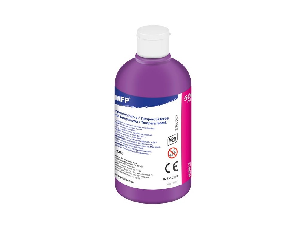 Temperové farby MFP 500 ml – fialová. Temperové farby sú pripravené k okamžitému maľovaniu, ľahko sa používajú a miešajú. Ľahko sa vyperú z väčšiny textílií, ale je dobré pred praním škvrny prečistiť ručným mydlom. Vysoká hodnota pigmentu vo farbe zaručuje maximálnu kryciu vlastnosť a kvalitu. Farby sú vynikajúco odolné proti vyblednutiu. Vďaka väčšiemu baleniu sú tieto farby vhodné pre školy, škôlky a rôzne umelecké krúžky. Farba: fialová Obsah farby v jednej fľaštičke: 500 ml VAROVANIE: Nevhodné pre deti do 3 rokov. Nebezpečenstvo prehltnutia malých častí. EN71 – 1,2,3,9 Uvedená cena je za 1 tubu.Dodatočné parametre