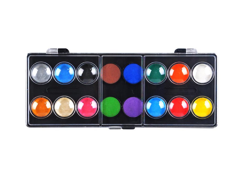 Súprava vodových farieb, 11 klasických a 5 metalických farieb, veľkosť puku 23 mm. Farby sú vhodné najmä na maľbu na papier alebo kartón. Namaľujte si s deťmi obrázok pomocou vodových farieb, ktoré vynikajú jasnou farebnosťou. Deti sa zabavia a navyše rozvinú motoriku ruky a svoju fantáziu. - vhodné pre školské a hobby použitie - vysoké krycie vlastnosti a kvalita - roztierateľné vodou - miešaním získate rôzne odtiene farieb, od hustých nepriehľadných až po priehľadné transparentné - priemer farby je 23 mm - neobsahujú toxické látky VODOVÉ FARBY OBSAHUJÚ: - 11 ks klasických farieb (biela, oranžová, tmavo zelená, modrá, hnedá, čierna, svetlo zelená, filaová, svetlo modrá, červená, žltá) - 5 ks metalických farieb ( zlatá, strieborná, modrá, béžová, ružová) VAROVANIE: Nevhodné pre deti do 3 rokov. Nebezpečenstvo prehltnutia malých častí. EN71-1,2,3,9 Uvedená cena je za 1 ks.Dodatočné parametre