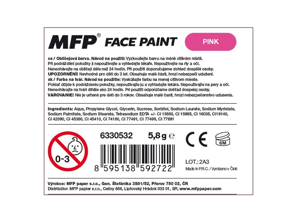 Farba na tvár ružová, na princípe rúžu (6 g). Vďaka týmto pestrým farbám vykúzlite na tvári dieťaťa krásnu masku na karneval, párty alebo inú oslavu. Dermatologicky testované. Farba: ružová NÁVOD NA POUŽITIE: 1. Odporúčame vyskúšať farbičky na menej citlivom mieste. 2. Ak dôjde k podráždeniu pokožky, nepoužívajte a vyhľadajte lekára. 3. Nepoužívajte na pery a oči. 4. Farbičkami maľujeme na suchú pokožku. 5. Jednoducho umývateľné vodou a mydlom, farby zdravotne nezávadné. 6. Neodporúčame nechávať na tvári dlhšie ako 24 hodín. 7. Pri použití odporúčame dohľad dospelej osoby. VAROVANIE: Nevhodné pre deti do 3 rokov, nebezpečenstvo prehltnutia malých častí. Všetkých 12 ks je balených v papierovej krabičke. Uvedená cena je za 1 ks.Dodatočné parametre