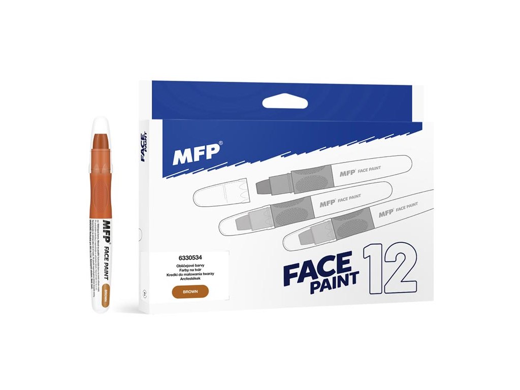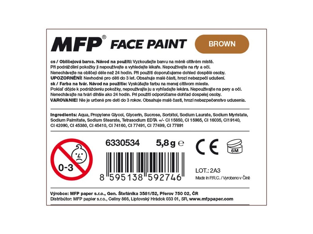 Farba na tvár hnedá, na princípe rúžu (6 g). Vďaka týmto pestrým farbám vykúzlite na tvári dieťaťa krásnu masku na karneval, párty alebo inú oslavu. Dermatologicky testované. Farba: hnedá NÁVOD NA POUŽITIE: 1. Odporúčame vyskúšať farbičky na menej citlivom mieste. 2. Ak dôjde k podráždeniu pokožky, nepoužívajte a vyhľadajte lekára. 3. Nepoužívajte na pery a oči. 4. Farbičkami maľujeme na suchú pokožku. 5. Jednoducho umývateľné vodou a mydlom, farby zdravotne nezávadné. 6. Neodporúčame nechávať na tvári dlhšie ako 24 hodín. 7. Pri použití odporúčame dohľad dospelej osoby. VAROVANIE: Nevhodné pre deti do 3 rokov, nebezpečenstvo prehltnutia malých častí. Všetkých 12 ks je balených v papierovej krabičke. Uvedená cena je za 1 ks.Dodatočné parametre